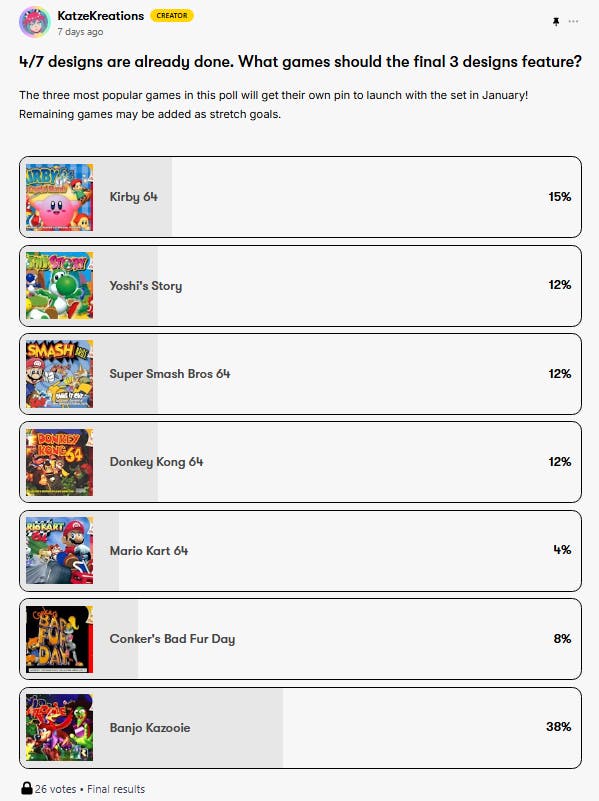 It helped me decide the next two pins that'll get designed: Banjo Kazooie and Kirby 64!