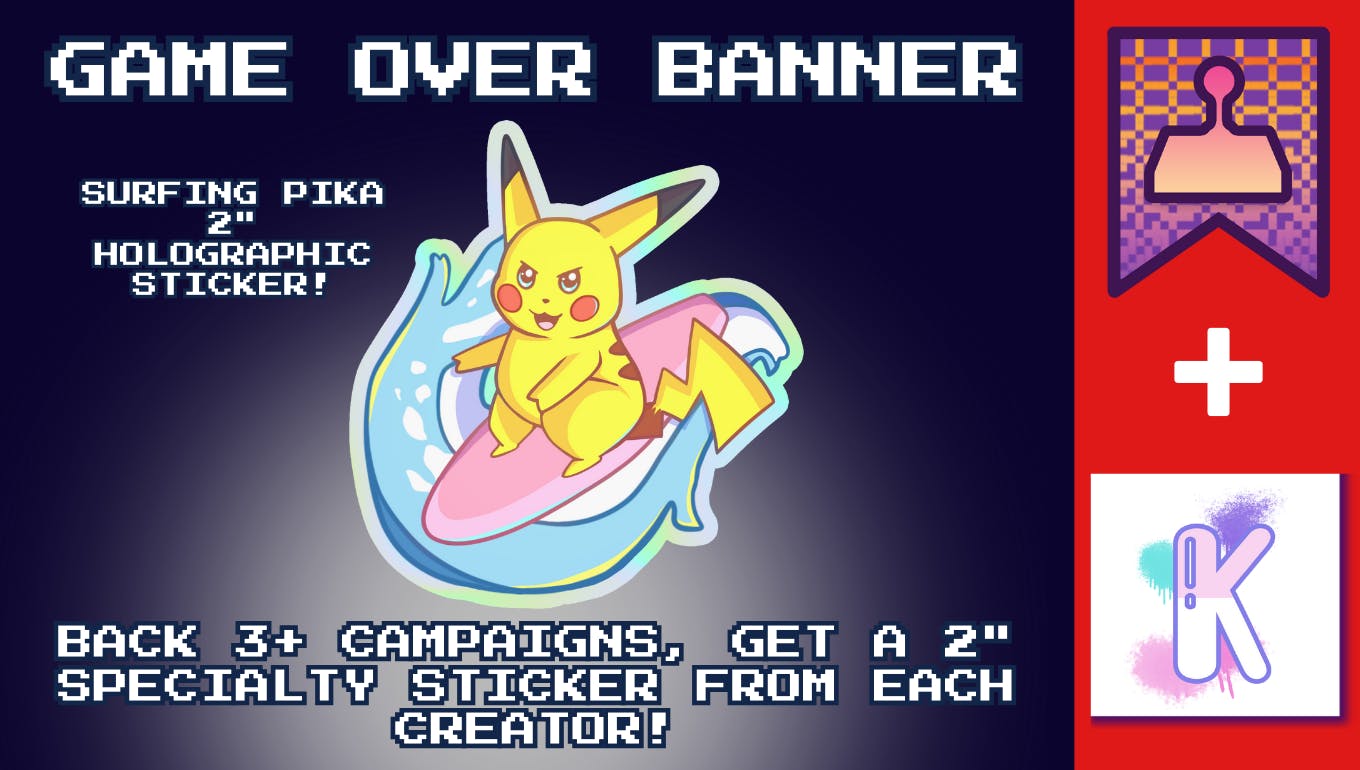 There are plenty more freebies where that came from, including 2 free pins if you back my cross-collab with Rexus Illustrations' PS2 themed campaign, Save Files, and free specialty stickers from each creator if you back 3+ projects under the Game Over banner (a group of gaming themed campaigns all part of Pintopia!)