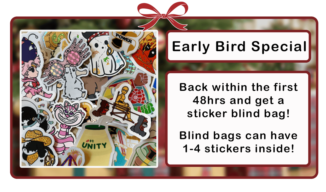 Get your holiday shopping done here in the first 48hrs and get a free sticker bundle! Sticker bundles can have 1 to 4 stickers inside! A fun little gift for yourself to unwrap! ^.-