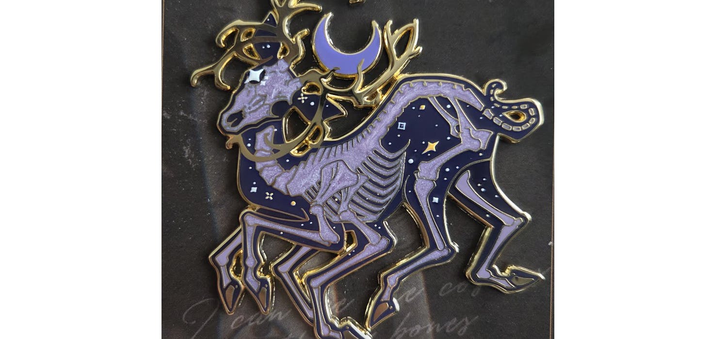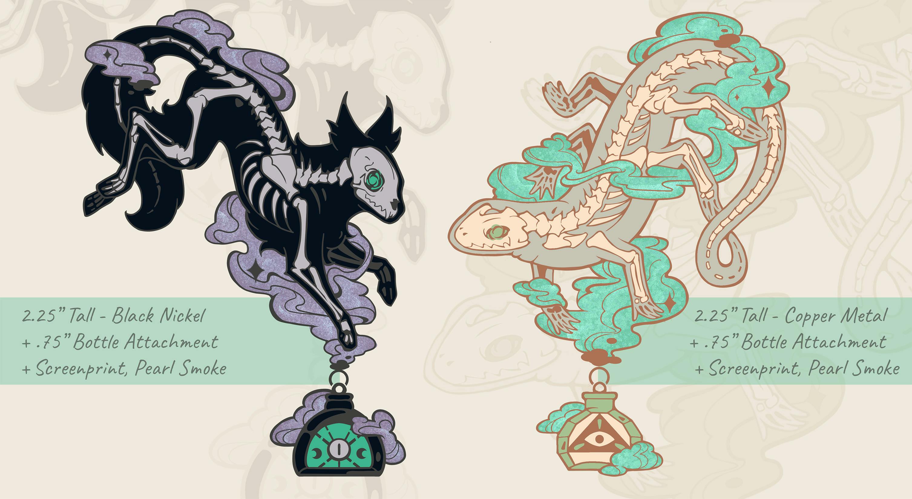 The two final pins with a dangling attachment: the bottled skeletal familiars! I'm really excited for these two. Each feature a little bottle attachment, as well as pearl smoke. As a quick disclaimer: my manufacturer has a more subtle, shimmery pearl enamel. I find it very pretty, but it's less bold than some other manufacturers' pearl enamel.