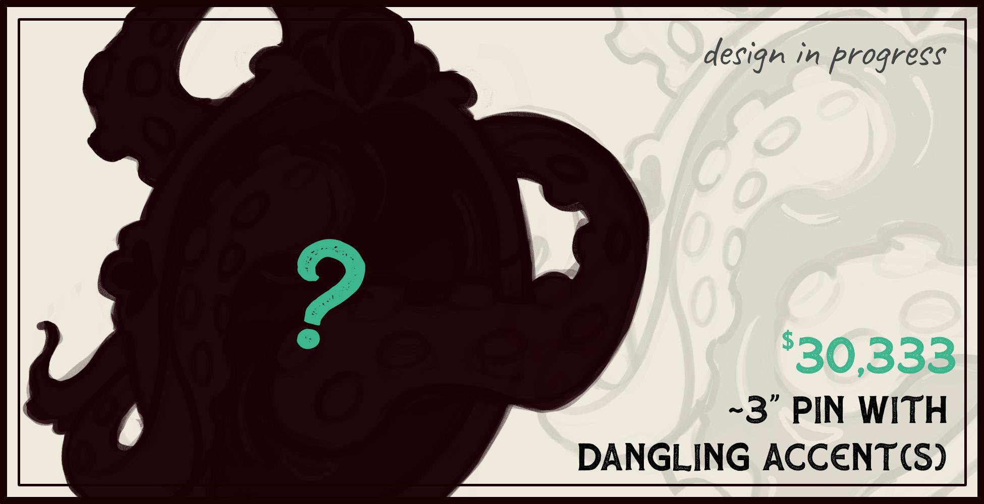 This set will follow the black nickel & copper color scheme—except for the little portraits/cameos. I am planning for those to be black nickel or dyed black metal. I'm aiming for all these pins to be roughly 1", but some may need to be bumped up in size slightly. As we get a bit closer to $28K, I'll make these available as add-ons and likely as their own tier for folks who just want the small pins. There will probably also be a higher tier that has the full collection of unlocked pins + the small pin set.