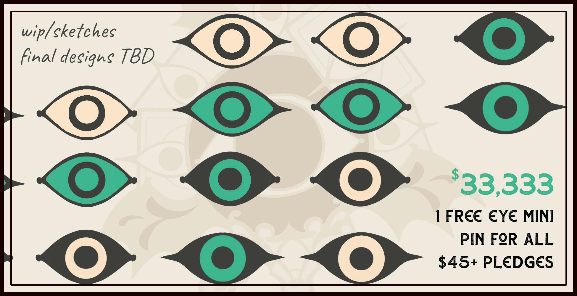 Lastly, more eyes If we hit $33,333, some tiny little eye filler pins will be available! And not only that, a little eye will be given as a freebie for everyone who pledges $45 or more.
