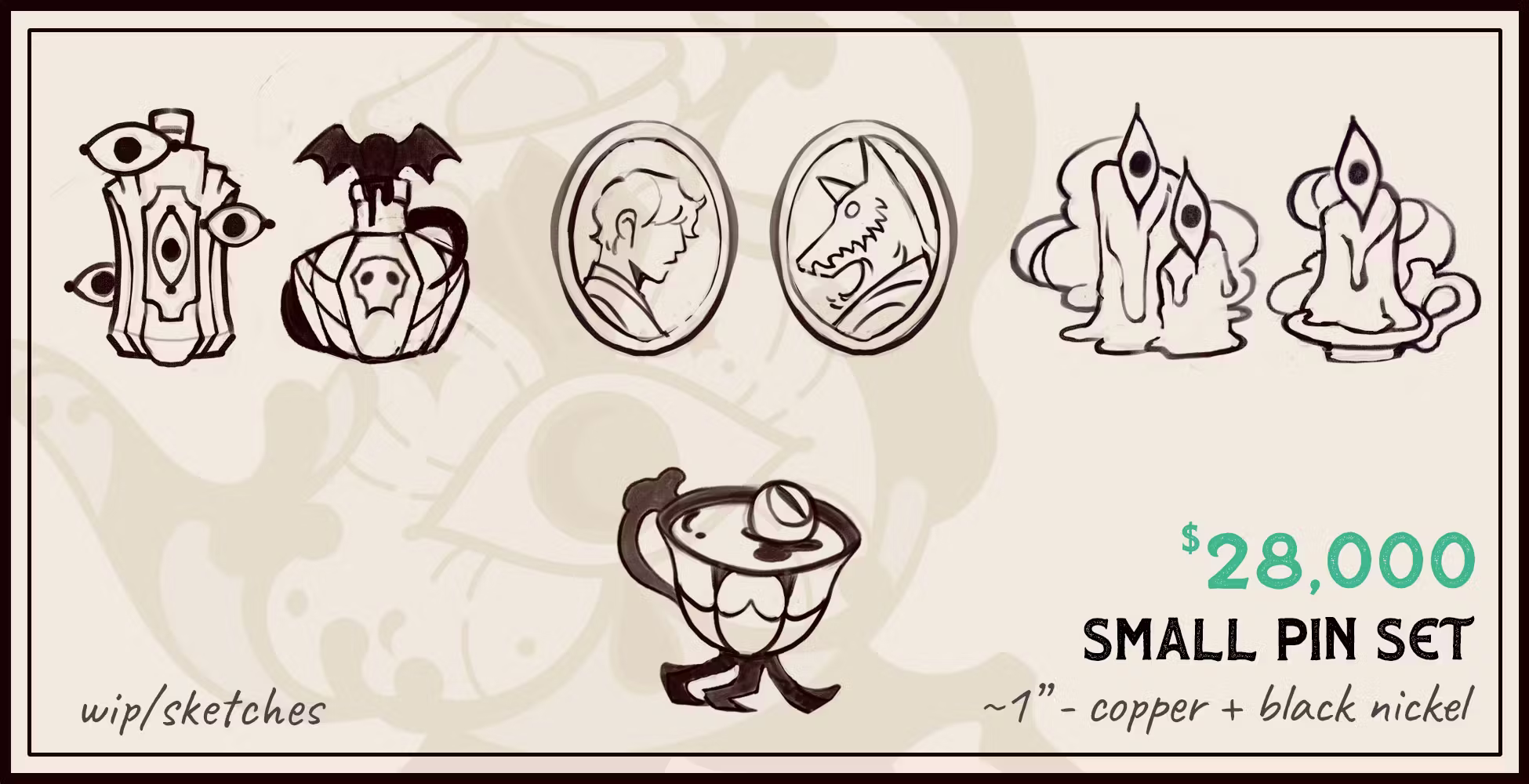 A set of small (~1") pins was the clear winner of our stretch goal poll! I've placed this set at a goal of $28k—which I think it definitely within reach. I spent a lot of time this weekend developing and refining sketches, and I'm very happy with where they're going: