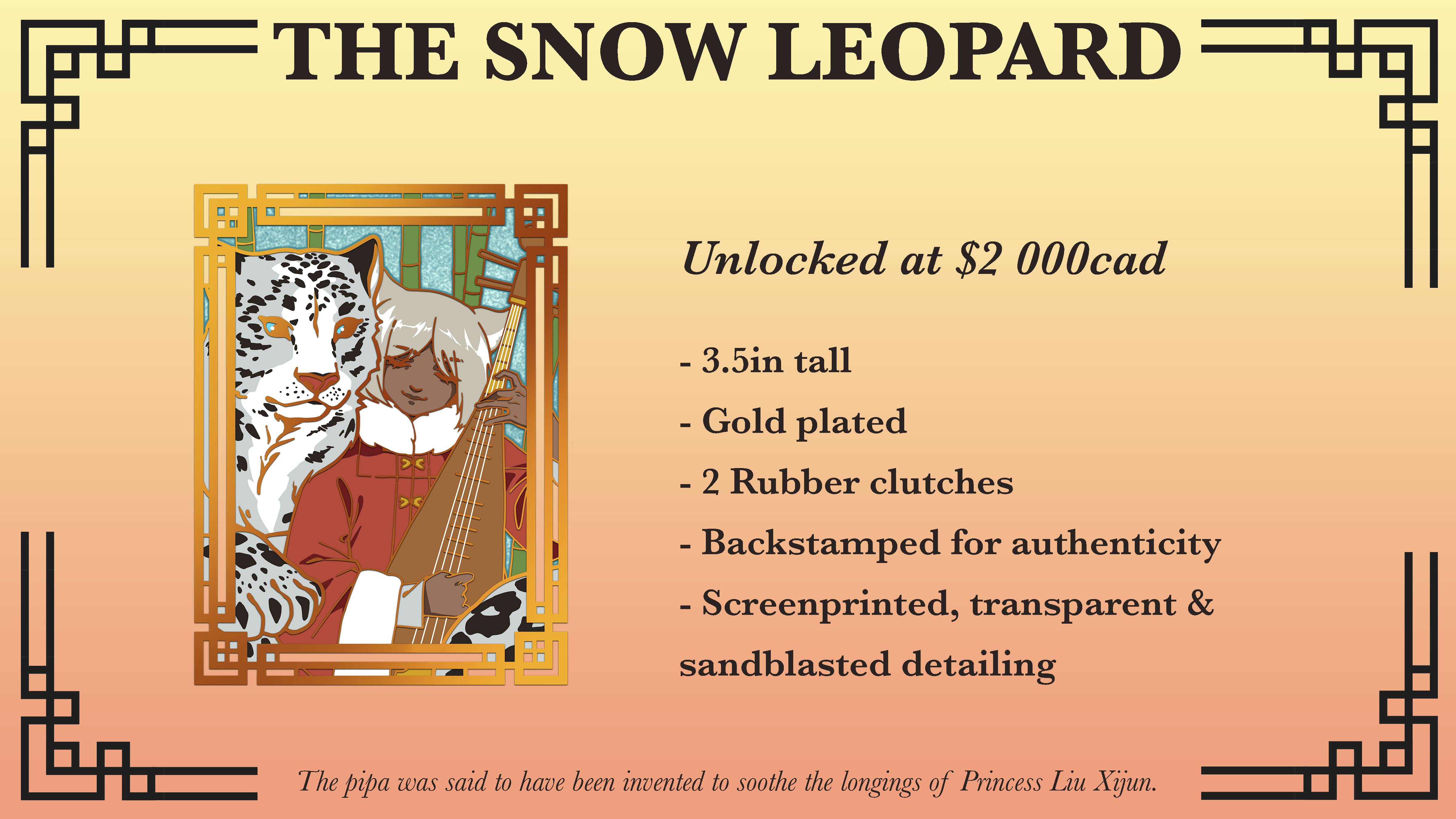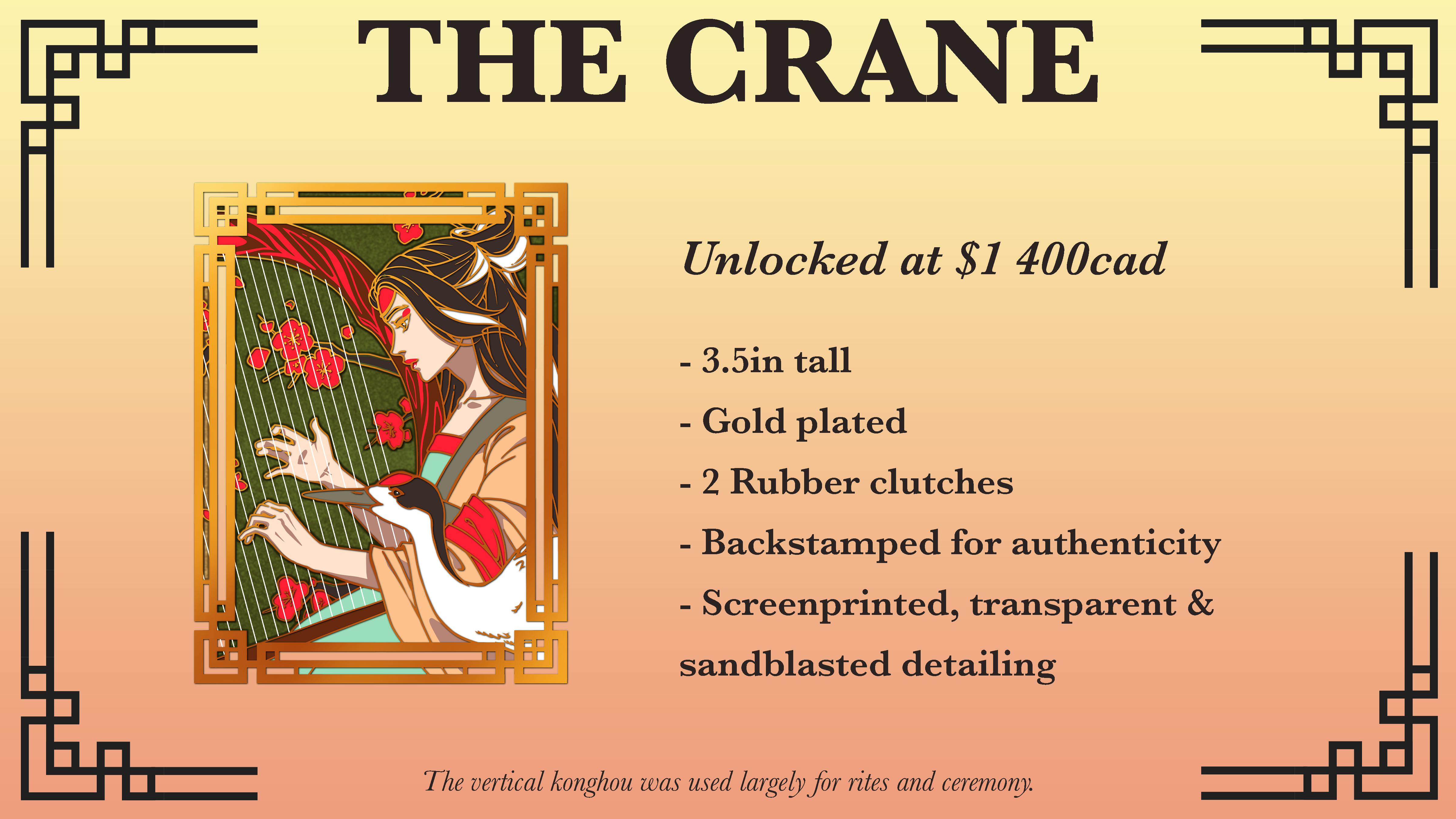 All campaign pins will be 3.5in in height and gold plated in hard enamel. All designs will be backstamped with my signature and come with 2 rubber backing posts for stability. All pins will feature extensive detailing with a mix of transparent enamel with sandblasted plating, intricate cutout frame, screen printing, and special effect enamel colours.