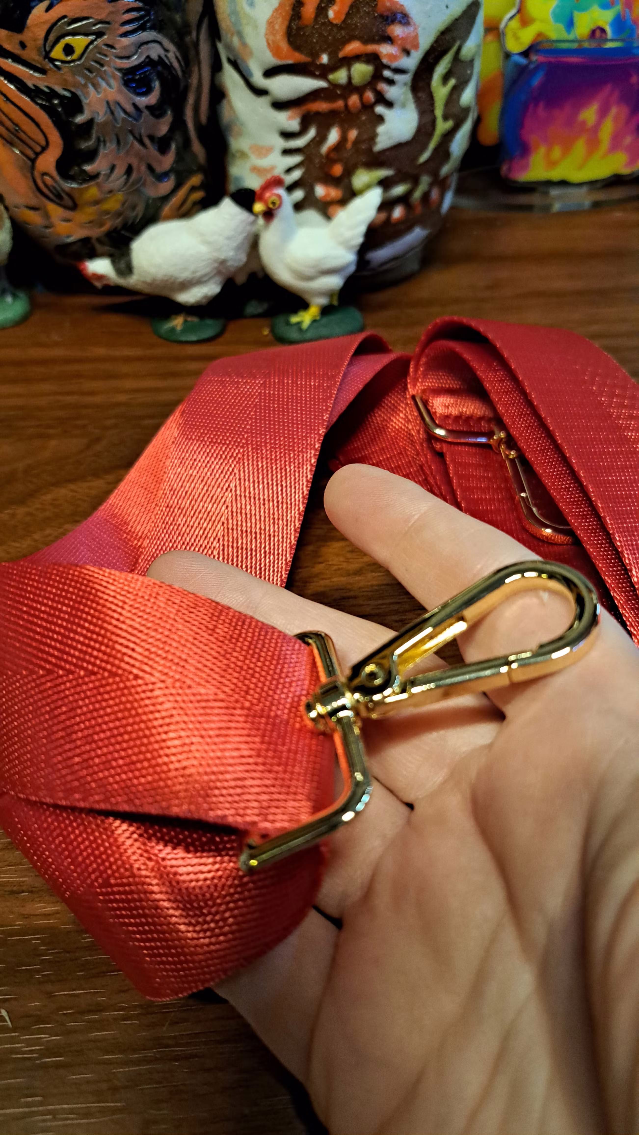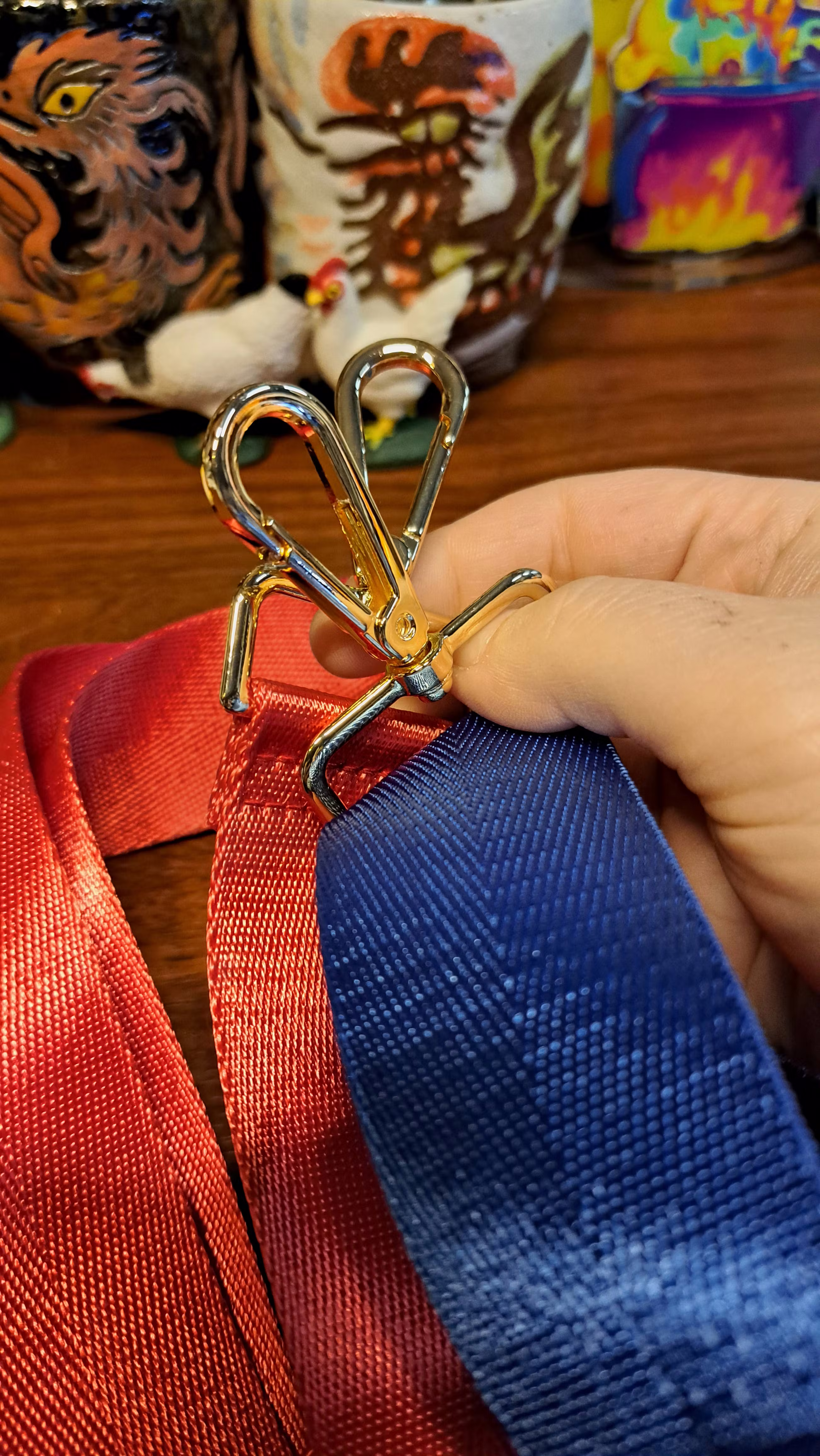 Here's some quick phone photos to show what we've received! You can see the double keychain attachment for the salmon and tuna, and the width of/hardware on the new straps. These are what have been approved for manufacturing when we reach that point.