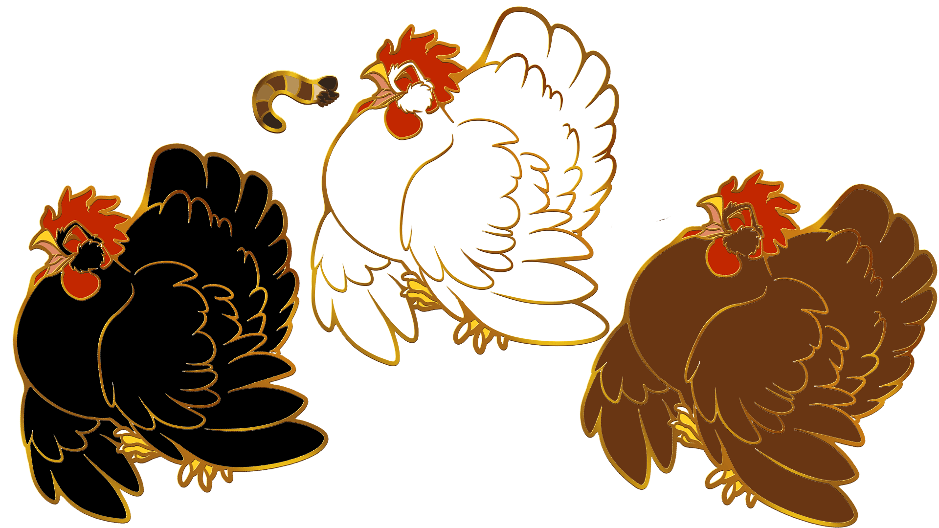 For those of you who might not have spotted them, here is the final pin's design along with the two alternate colors it has! A chicken and a mealworm with gold finish. When people think of chickens in relation to meat eating they are usually imagining the chicken as the meat and many folks believe chickens are natural vegans. Not so! If they can swallow it easily it is fair game, be it made of moss, meat, or metal (I wish that last one wasn't true because no, they can't digest screws.) Their diet is especially insect-heavy, but I've personally seen them eat rodents, nestling birds, lizards, frogs, and snakes. They will grab any tiny animal they can catch and start smacking it against the ground with more vigor than a seriema, if they even bother making sure it isn't moving before swallowing it. They are little fluffy killers!