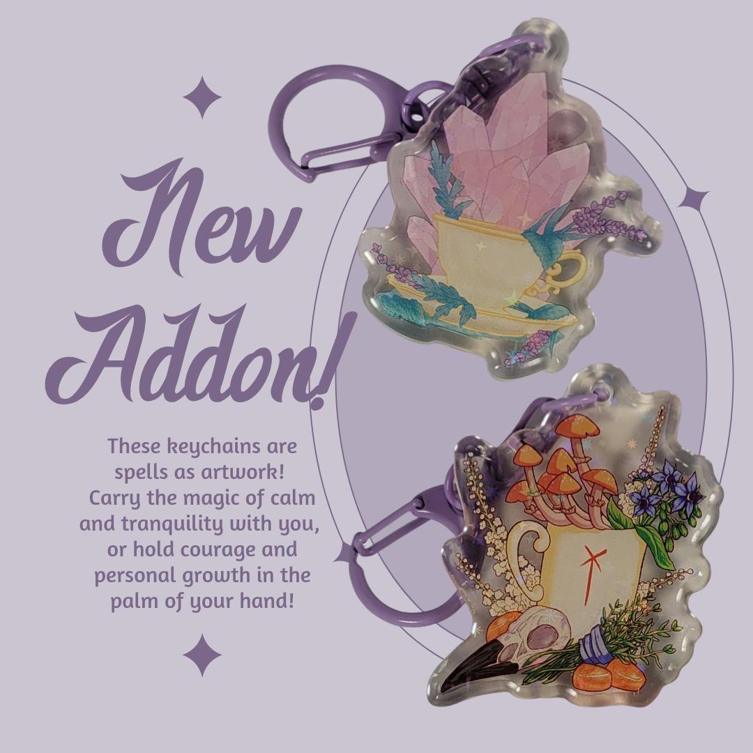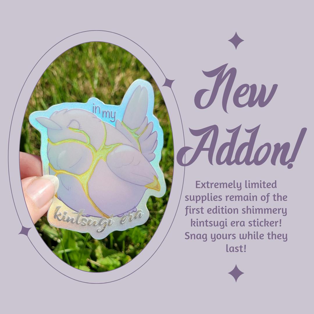 Next, a couple new addons to announce. First: These holo sparkle keychains feature double sided prints of spell art made portable! Carry these works of magic with you to welcome their energies into your life! Featured designs include a spell for calm and tranquility and a spell for courage and personal growth. These designs may be featured in future enamel pin Backerkit campaigns! From my very first campaign, the last of the first edition kintsugi era stickers will be made available on a first-come-first-served basis! There are only slightly more than a dozen of these beauties left, bring one home and see how she really shines in sunlight!