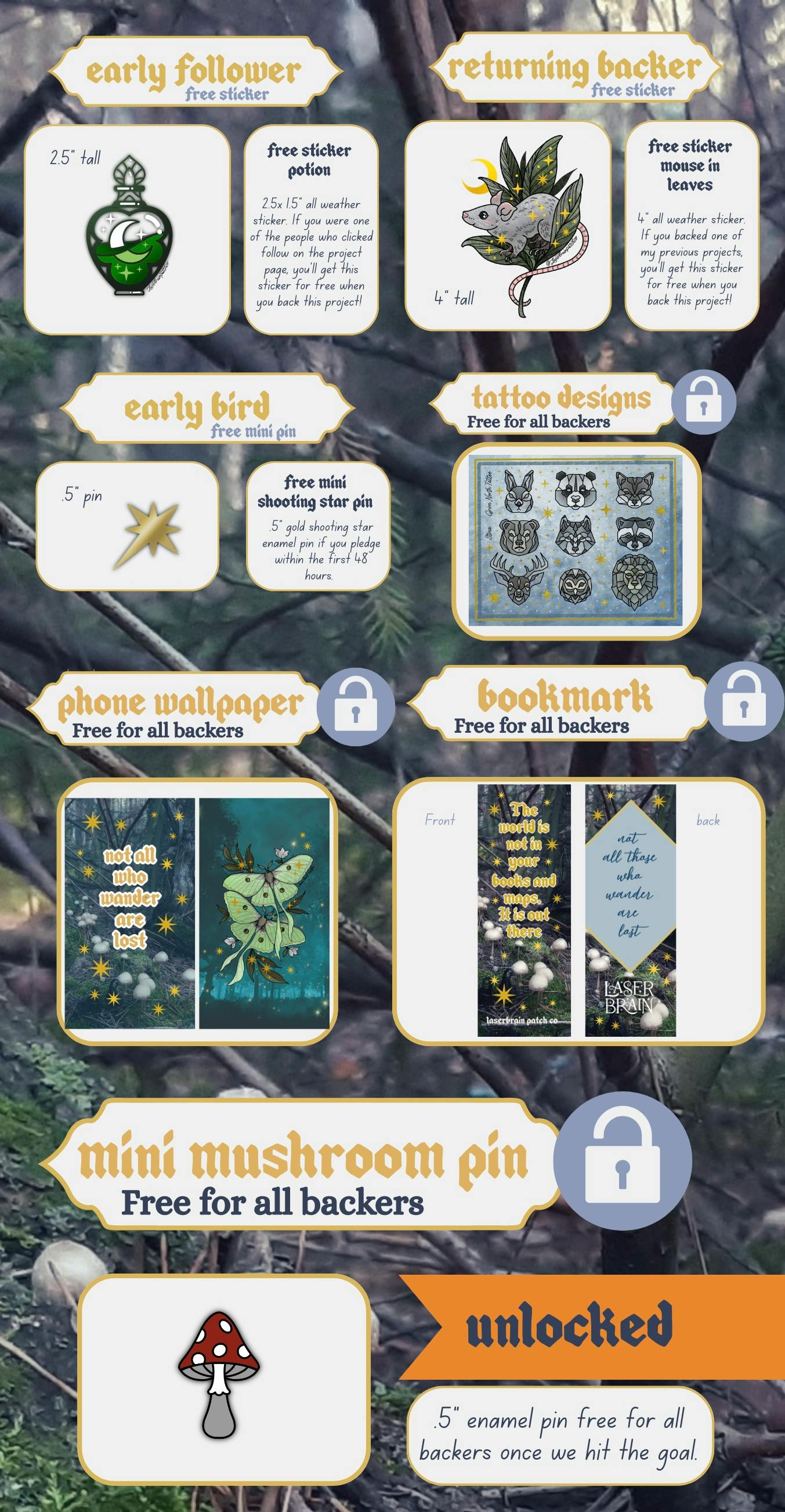 Ok y'all slammed through all of the levels and unlocked everything. THANK YOU!!!! We now have 🍄 6 premium enamel pins unlocked 🍄 24 knick knacks which can be pins or magnets