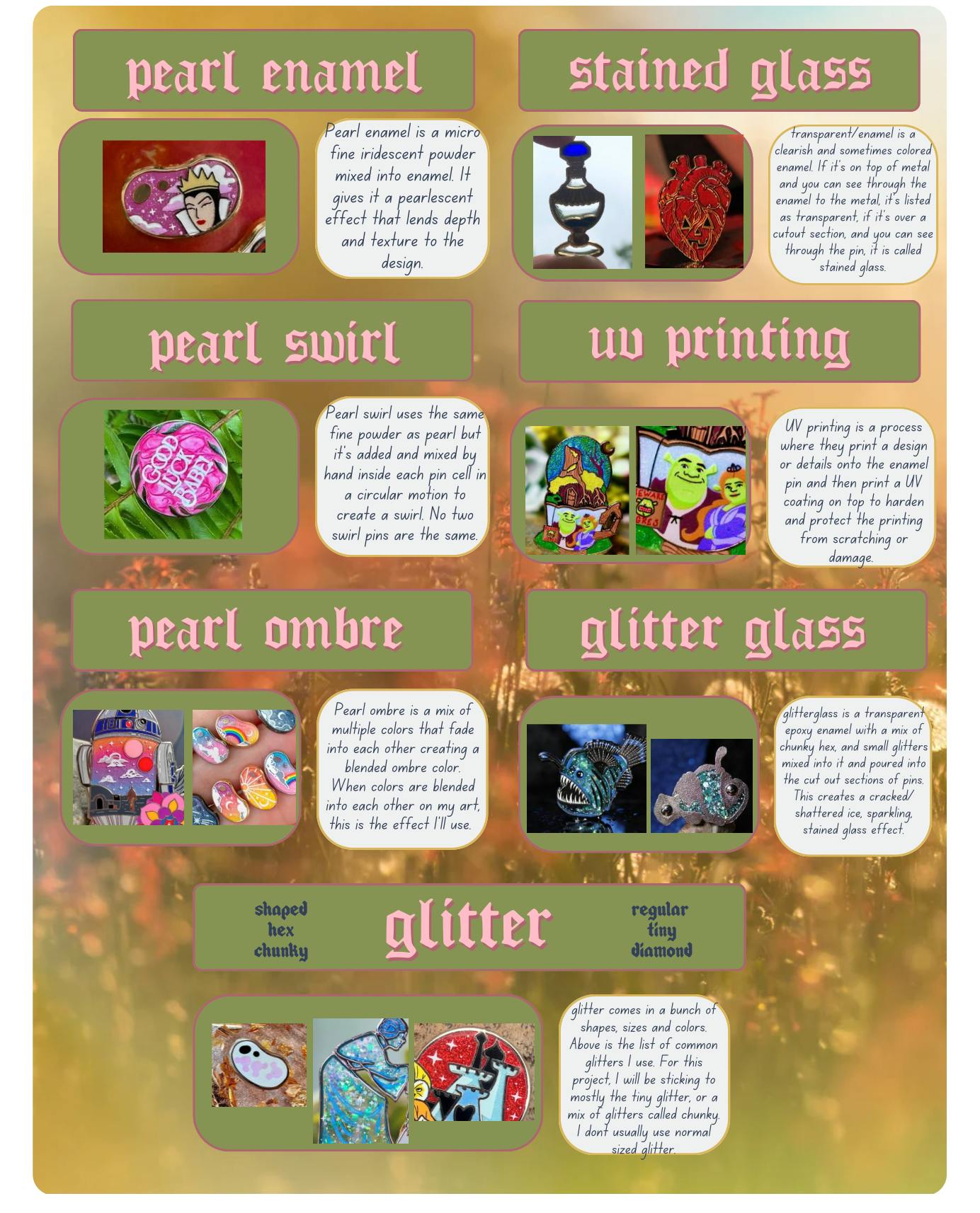 ⭐️There will be premium hard enamel pins; which vary from 2.5- 2.75", have 2 or more posts, and will have UV printing and effects (like glitter, pearl, ombre, Glow in the dark, or swirl pearl) and will be silver Nickel metal.