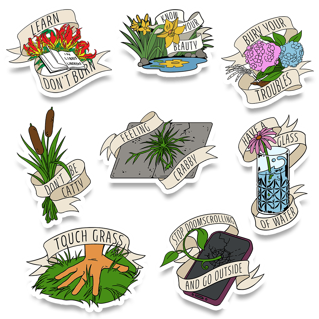 Enamel pins and stickers celebrate resistance and practical solutions for mental health and joy! We're tired, but we're strong. We're frustrated, but we renew our determination. We care for each other and for ourselves, and we remember what truly matters.