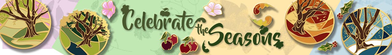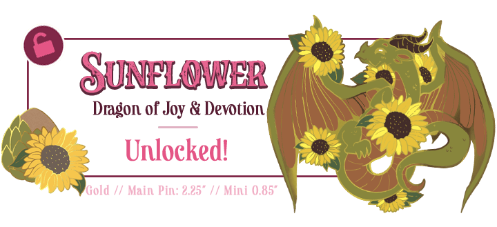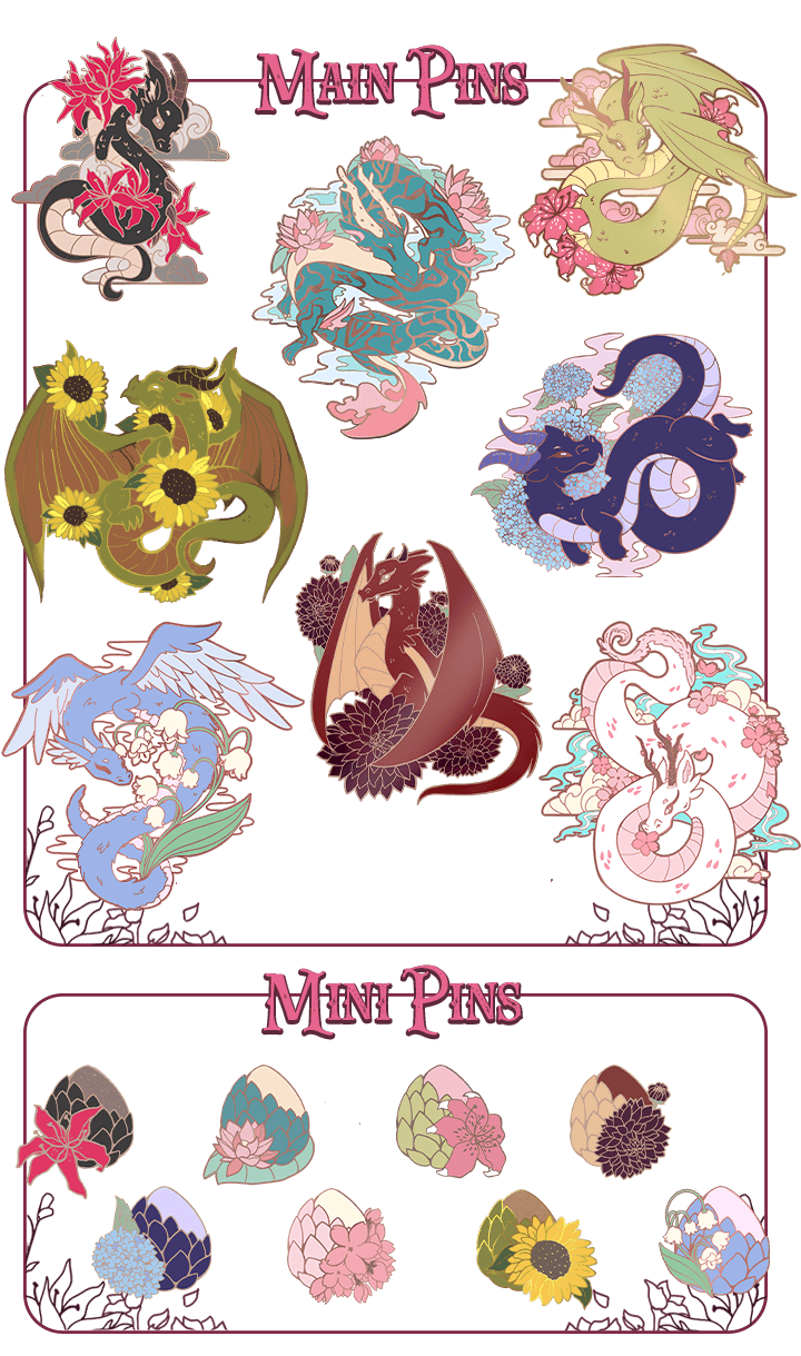 Our gardens have new guests: dragons! They each rest among the sunflowers, lilies, hydrangeas, and other blooms in these 1.8–2” pins, framed by flowers and drifting clouds.