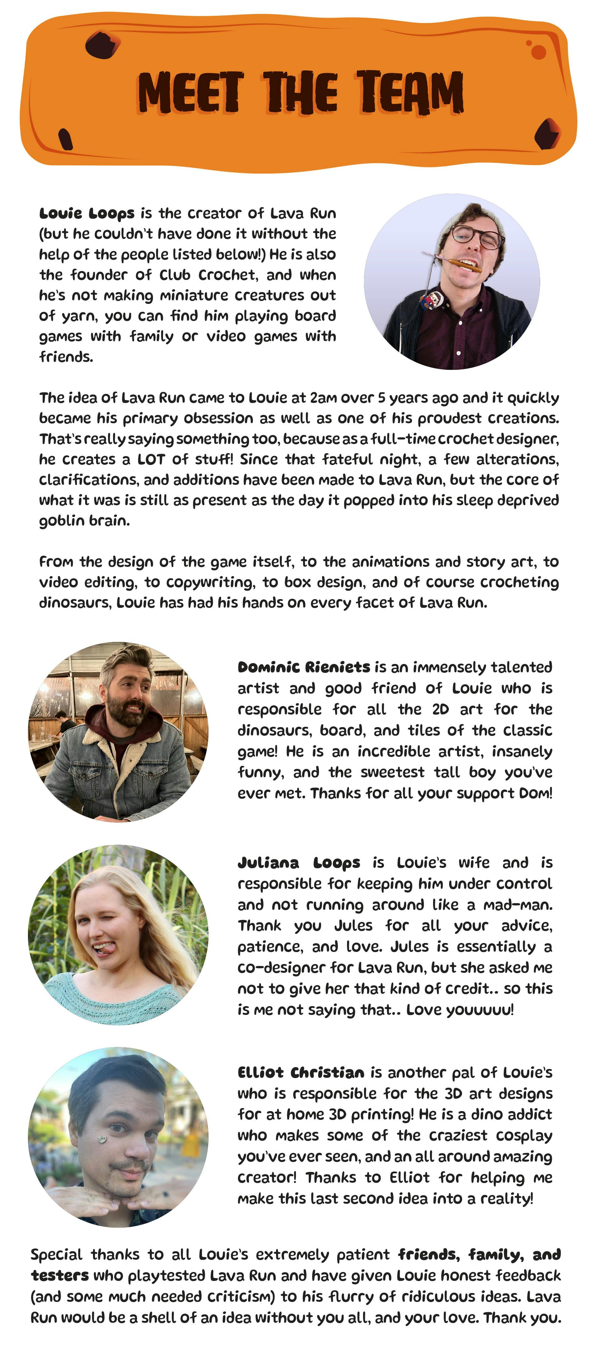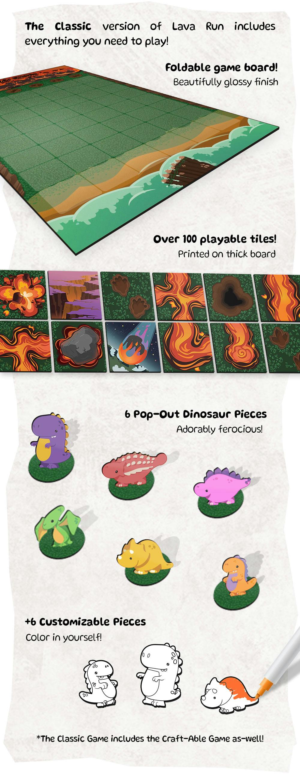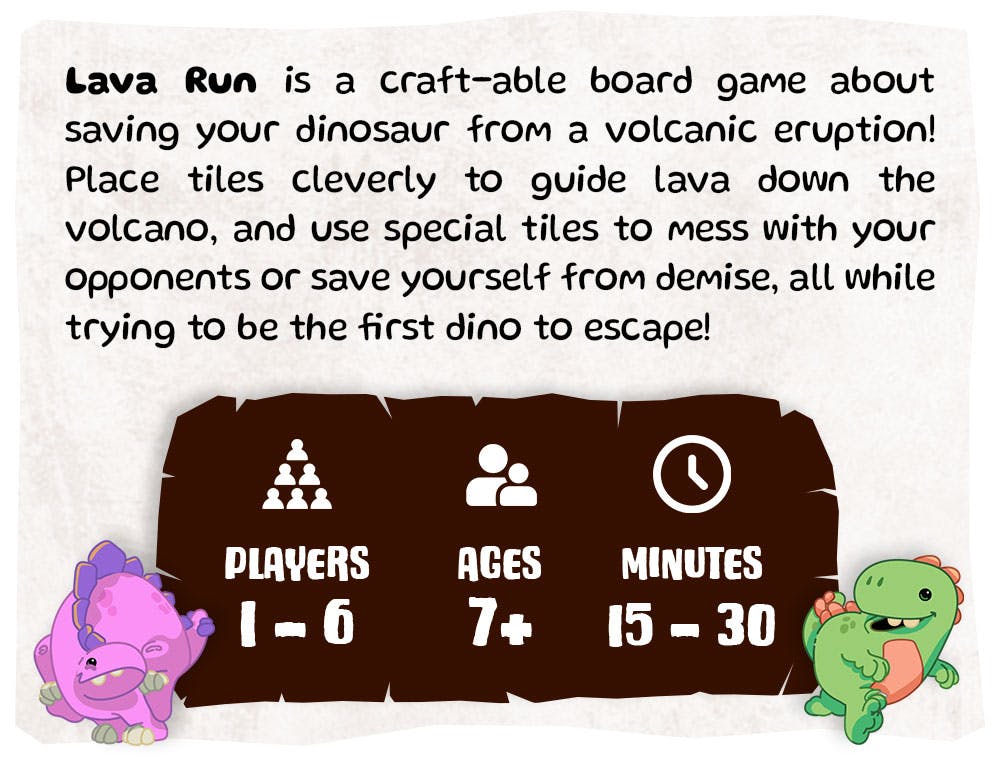 Lava Run is a craft-able board game about saving your dinosaur from a volcanic eruption! Place tiles to cleverly guide the lava as you move down the volcano. Use special tiles to mess with your opponents, all while trying to be the first dino to escape!