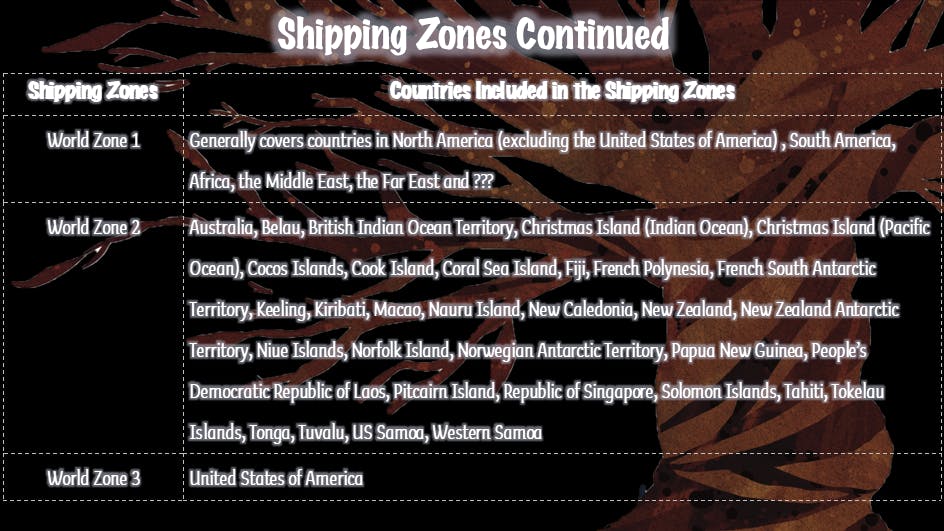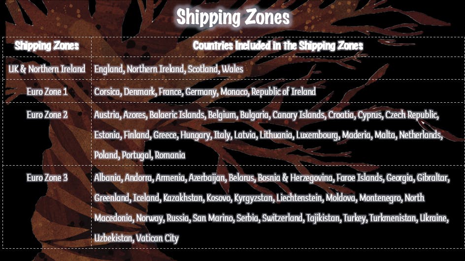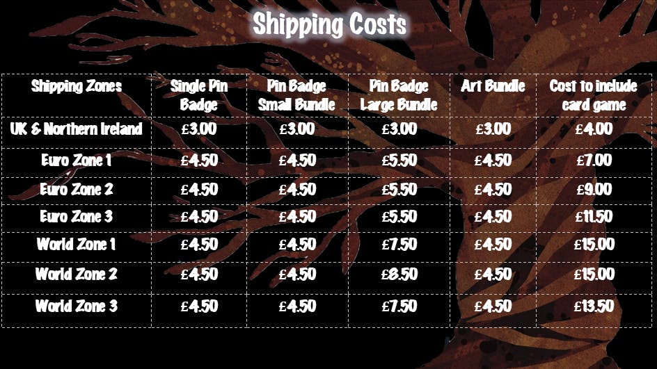 All estimates are based on shipping an individual pledge level. Please note any additional products purchased via Add Ons may add to this shipping cost. The table below contains shipping estimates based on Royal Mail shipping costs as at November 2025.