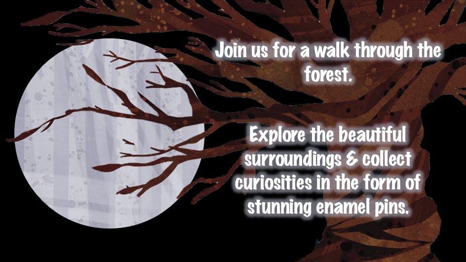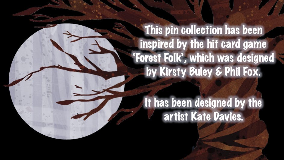 A Walk through the Forest is the first in a collection of forest based enamel pins featuring art from Kathryn Davies Art and inspired by the popular card game Forest Folk.