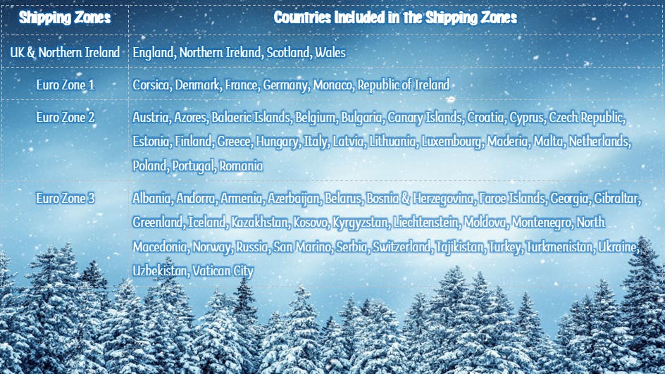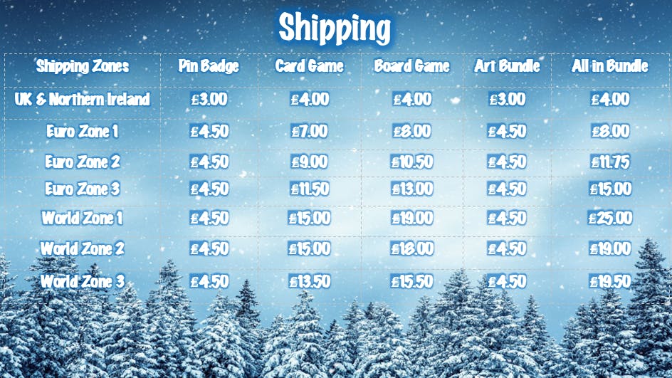 All estimates are based on shipping an individual pledge level. Please note any additional products purchased via Add Ons may add to this shipping cost. The table below contains shipping estimates based on Royal Mail shipping costs as at November 2025.