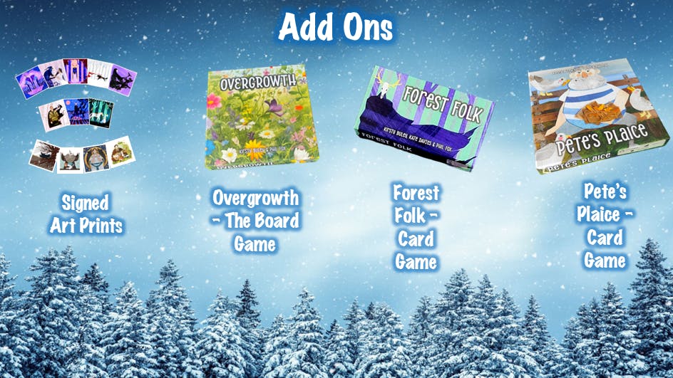 This pledge level includes our first card game design Forest Folk - Can you manipulate the forest to fulfil your pilgrims wishes in just 9 cards?