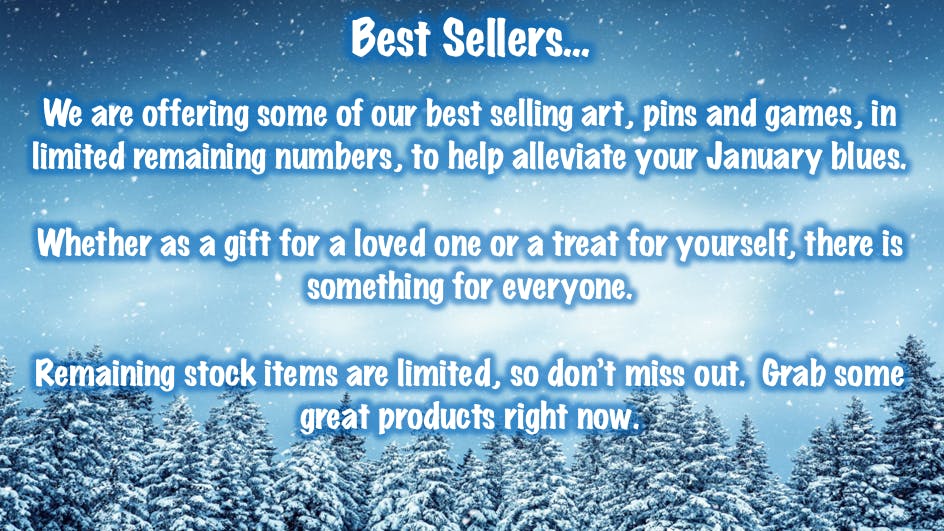 A selection of pins, art, board & card games to beat the January Blues. Some items are limited in stock, so don't miss out. All items are ready to ship straight away.