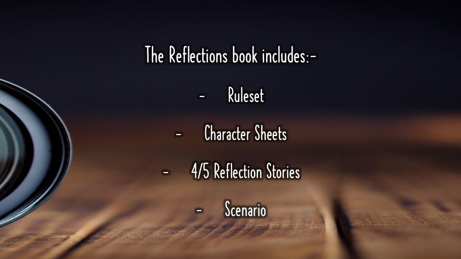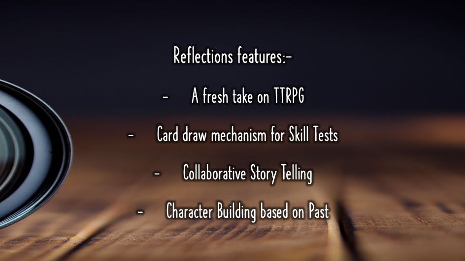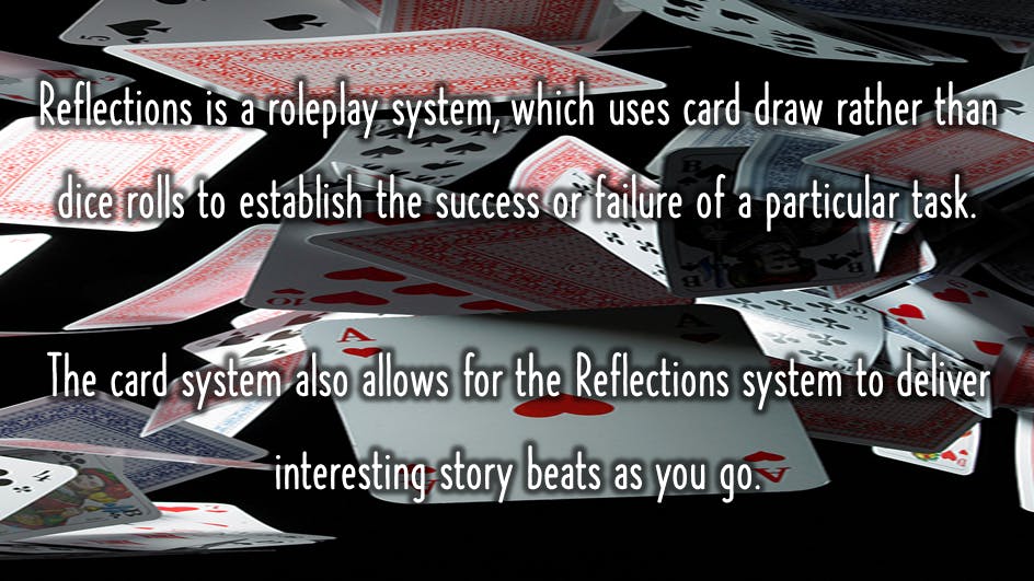 Reflections is a roleplay system, which uses card draw to establish the success or failure of a particular task. The system also delivers interesting story beats as you play.