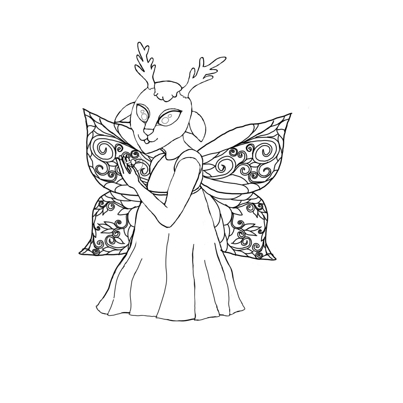 A fairy with elaborate wings and the facial features of a deer. She holds a smaller fairy in her hands.