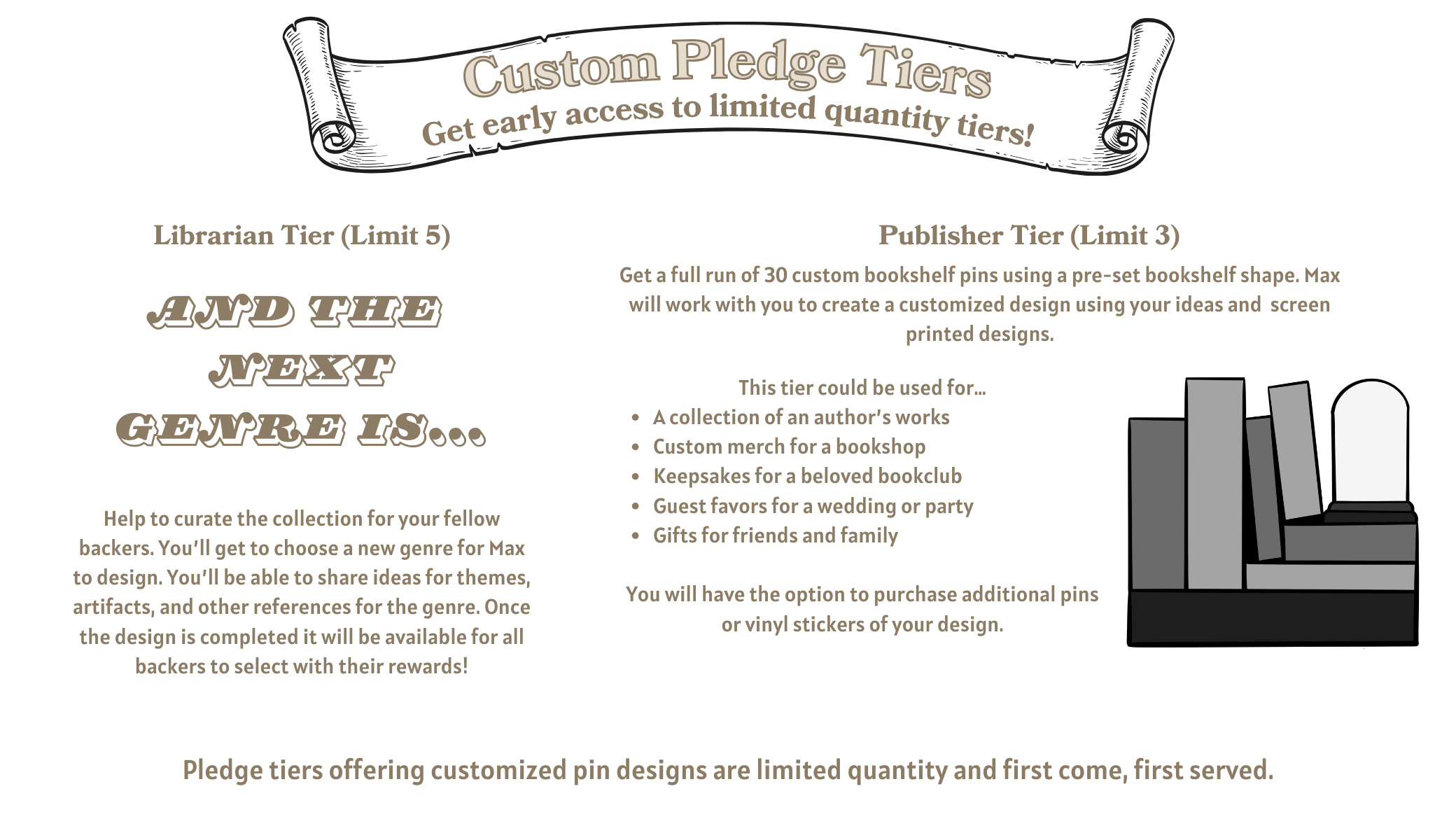 - You may upgrade any of your Bookcase pins to Deluxe Editions for +$3 during the backer survey