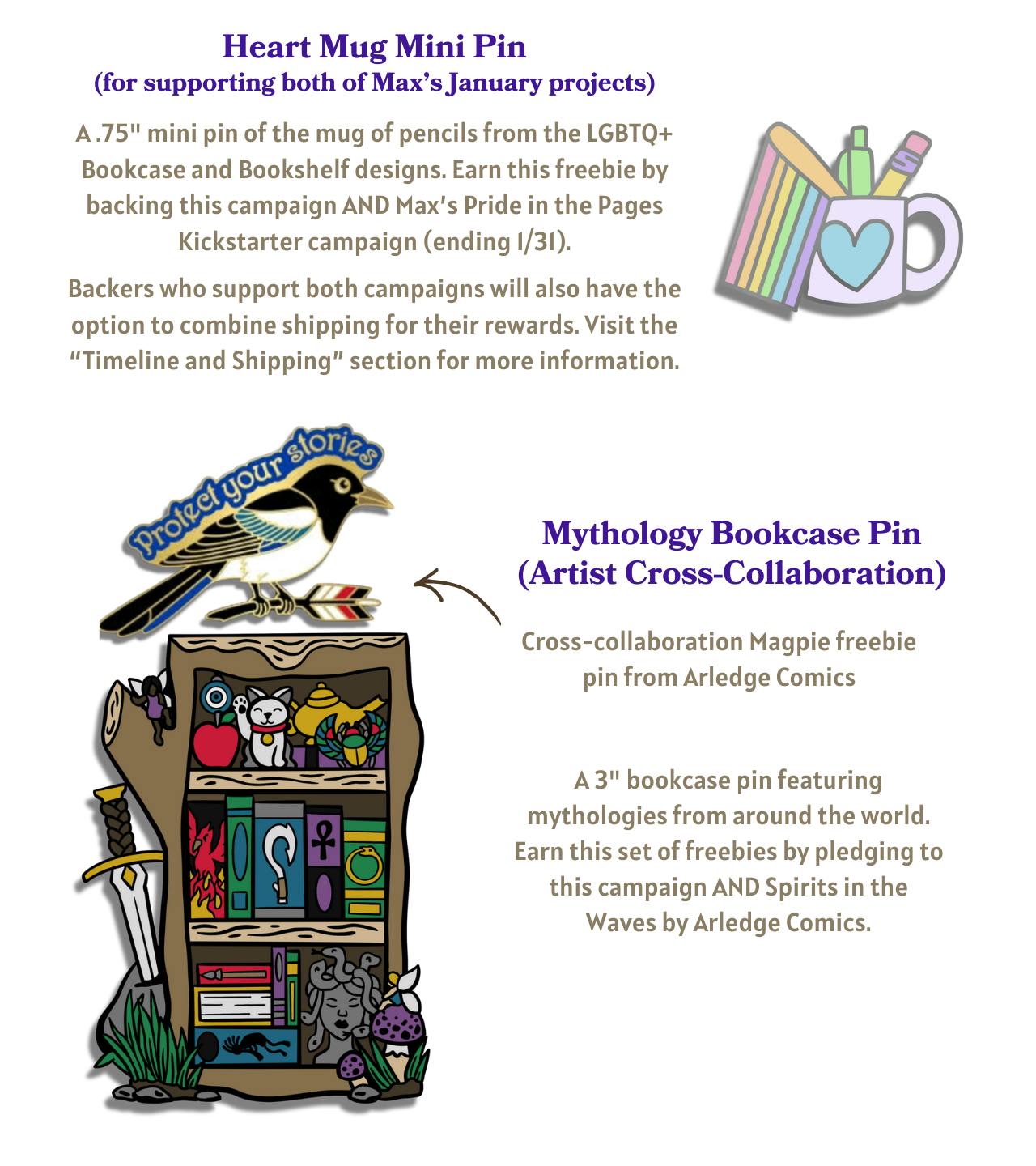 2. I am also running another campaign called Pride in the Pages on Kickstarter this month. Backers who support with projects will receive a free mini pin AND have the option to save money by combining shipping for their rewards. If you're new here, backing Pride in the Pages will also qualify you for the Returning Backer sticker.