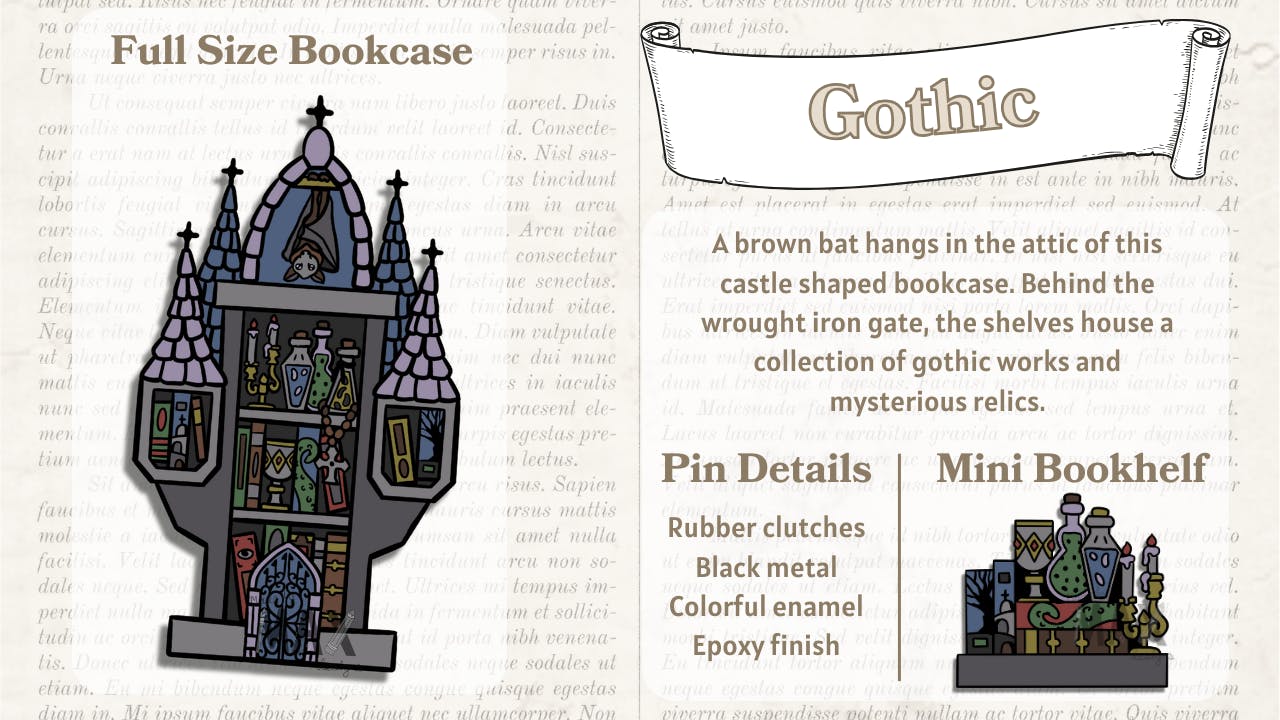 The Gothic bookcase is castle, but it's very different from the Fantasy castle design! The colors for this design are dark and moody with lots of atmospheric trinkets. I'm particularly fond of the little bat in the attic.