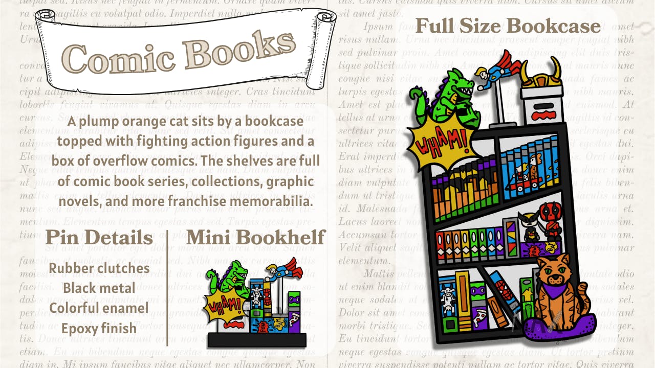 The Comic Books bookcase is a mixture of superheroes, series, and comic collections. Including a fat orange cat was inspired by Garfield, felt like a must for this design!