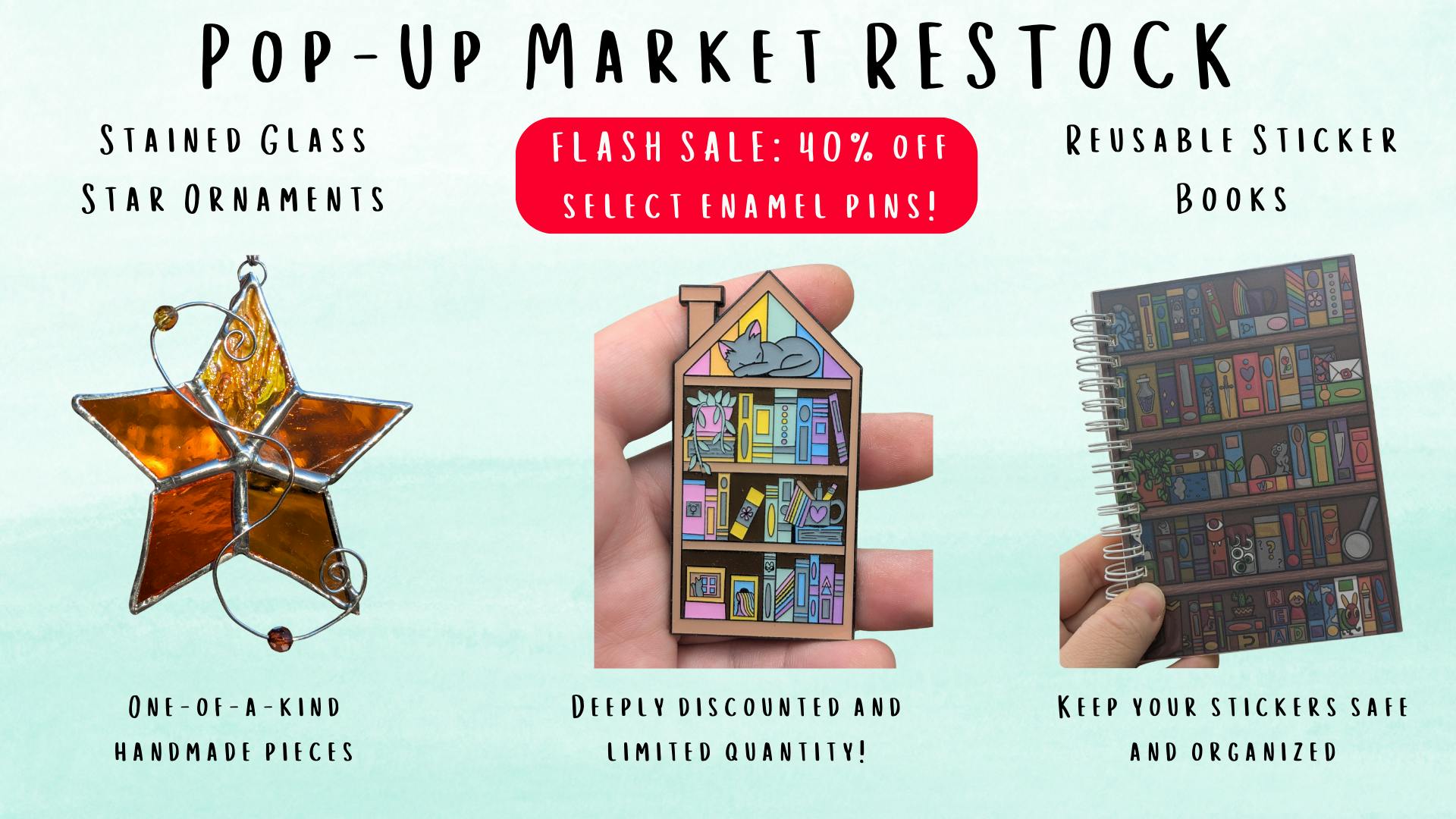 Backerkit's Holiday Market event will be winding down in a few days, so it's your last chance to shop my virtual pop-up shop! There are still plenty of discounted enamel pins, grab bags, and handmade stained glass décor and accessories left to choose from.