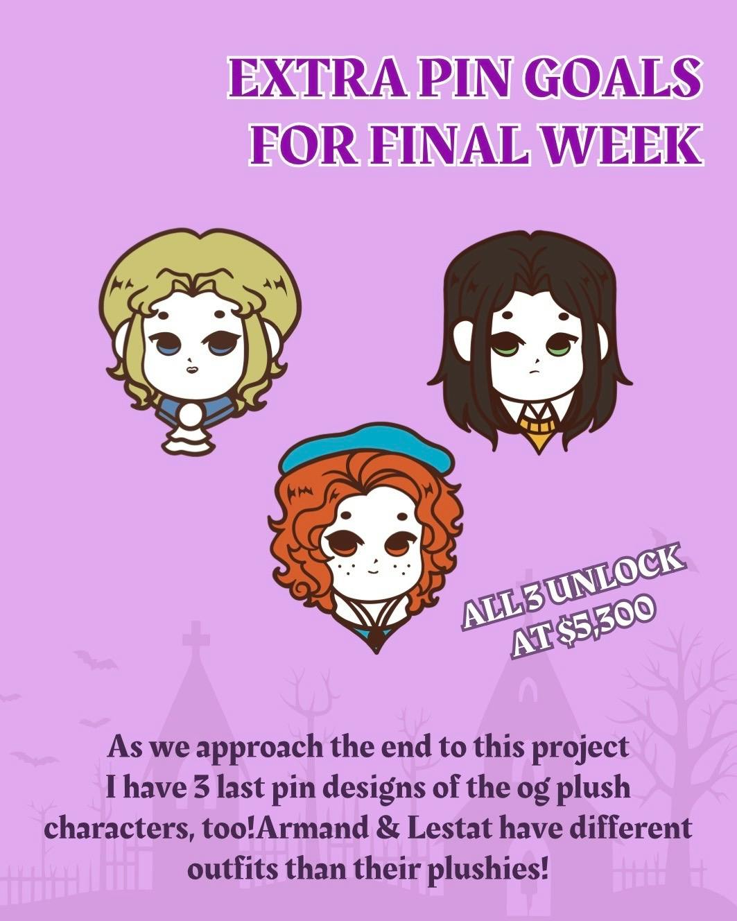 We also have 3 final pin designs we can unlock as another little goal during this final stretch of the campaign! If we do get close to funding the 4th plush, it can still be unlocked as a small goal during surveys that will be sent to you for you to select pin/plush designs & any add-ons!