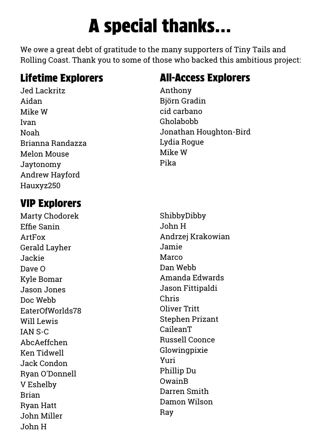 If your name isn't there, and you backed the project at the VIP Explorer, Lifetime Explorer, or All-Access Explorer level, please comment below to let us know.