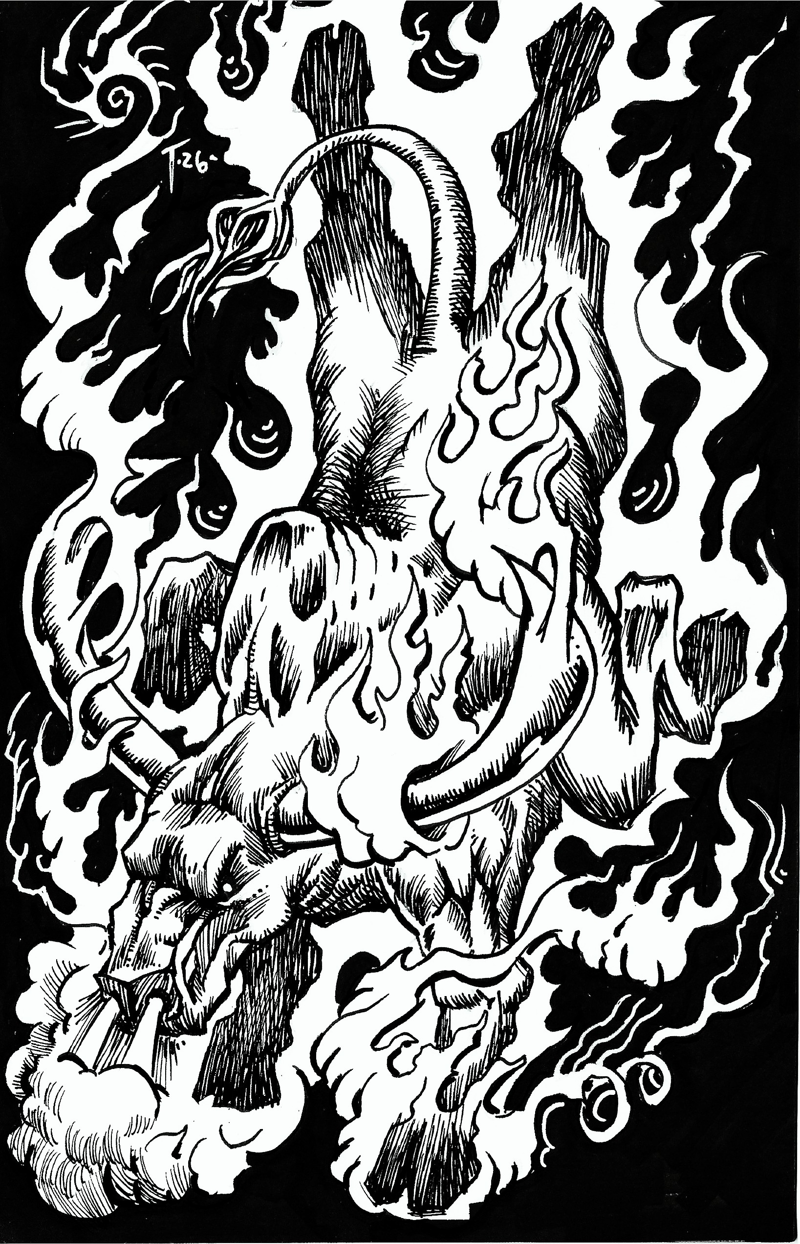 It moves on six terrible limbs, its form half-seen through a haze of flame and smoke. Its hooves do not strike the ground so much as wound it, and wherever it passes, doom follows. For when a dying unicorn turns at last toward the Far Garden, the Red Bull is already there, waiting in the twilight between worlds.