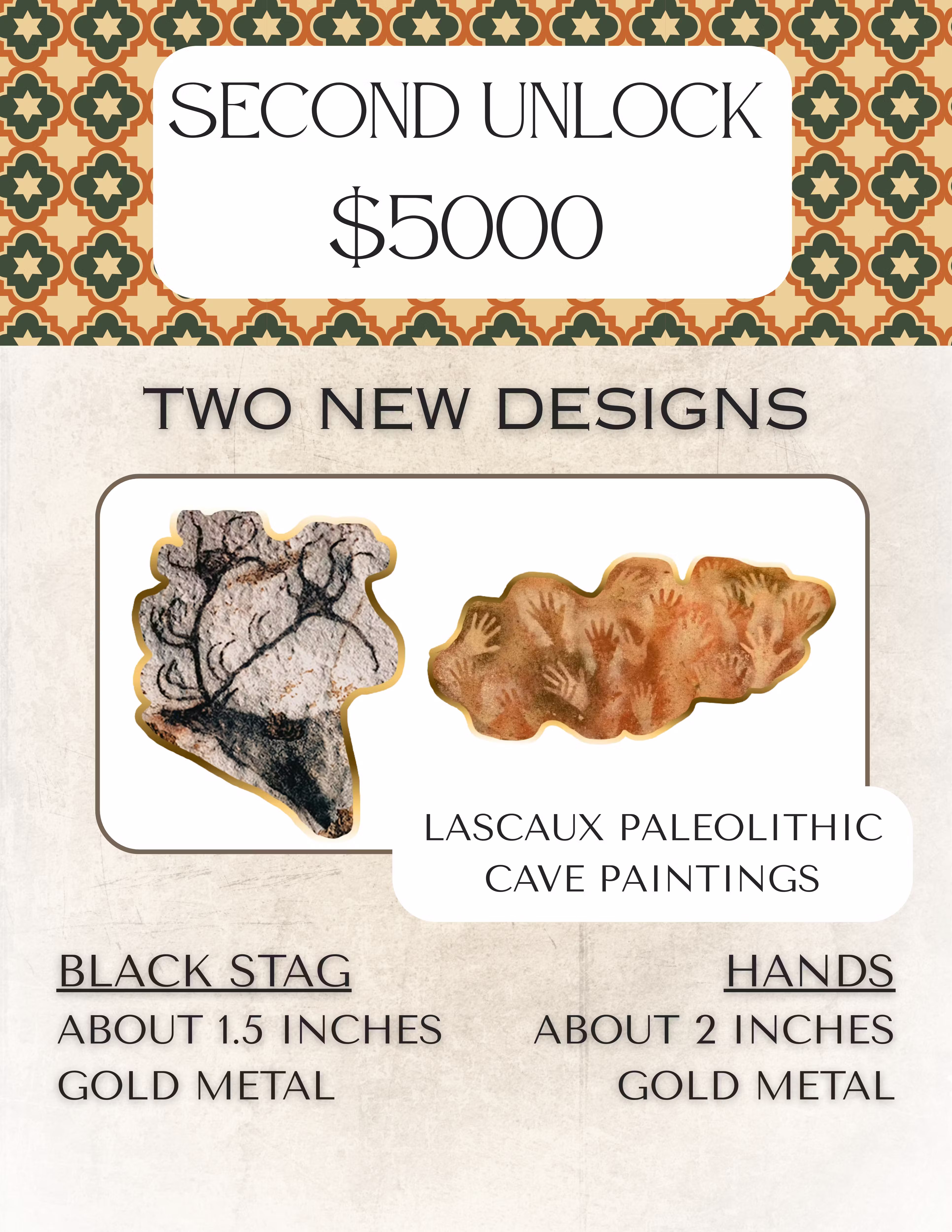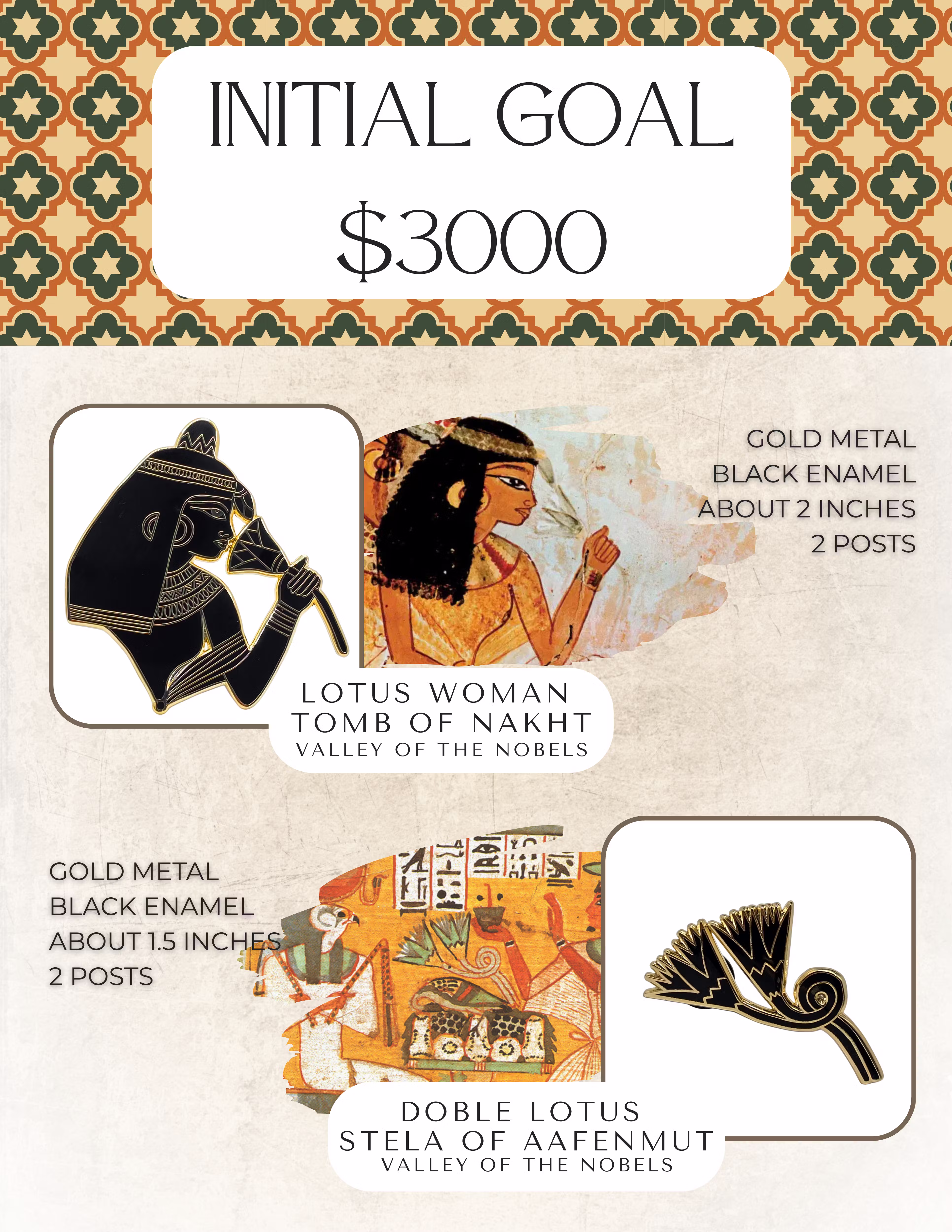 The $3000 goal will fund these 5 pins. The Nazca designs, and well as the double lotus pin at the $14 price point which is discounted for backers only from their final retail prices and the large Lotus woman pin at $18.