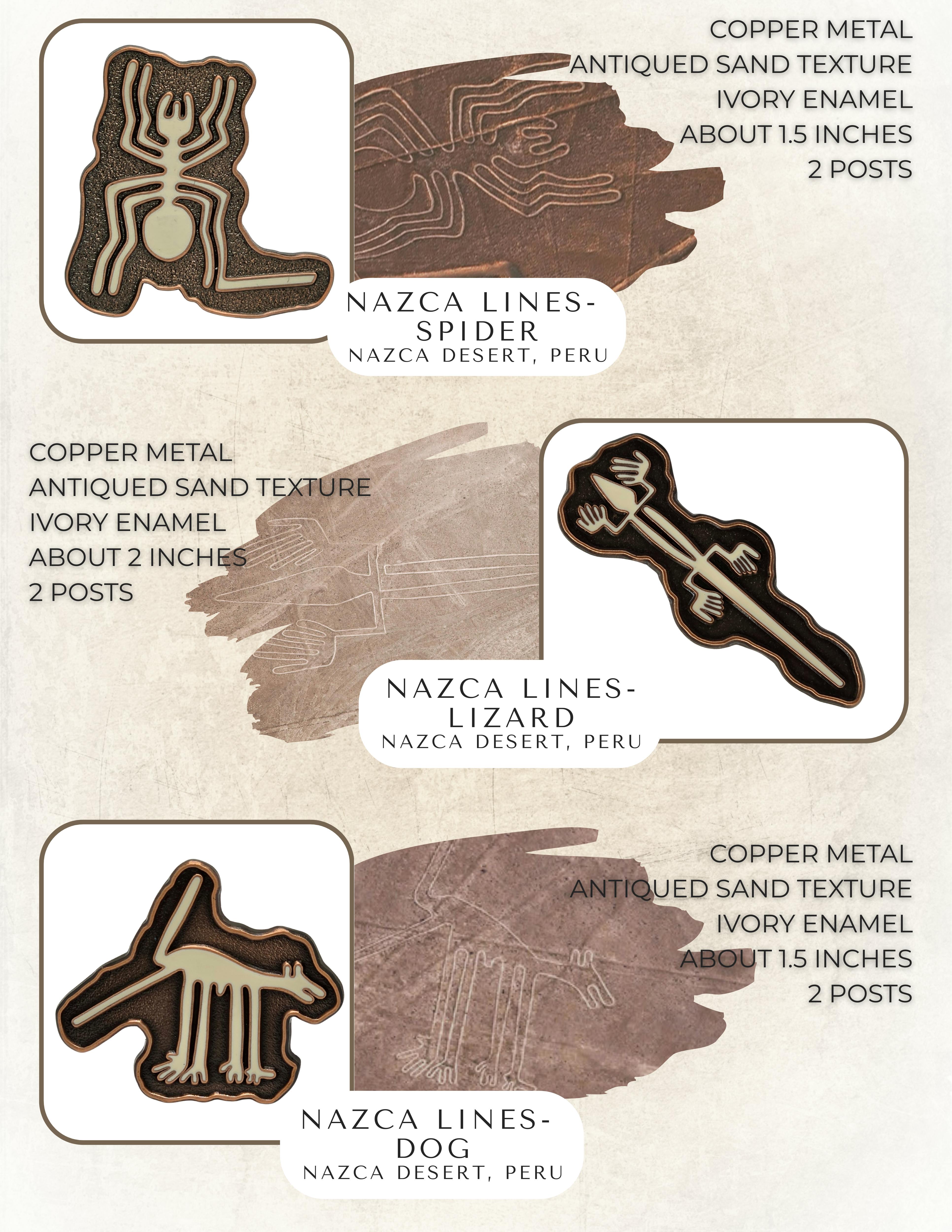 double lotus, Lotus woman Nazca Lizard, Nazca Dog, Nazca Spider. Above is the sample pins we had made to show you the exact pins, we need to reach the goal amount to create a whole batch of them.