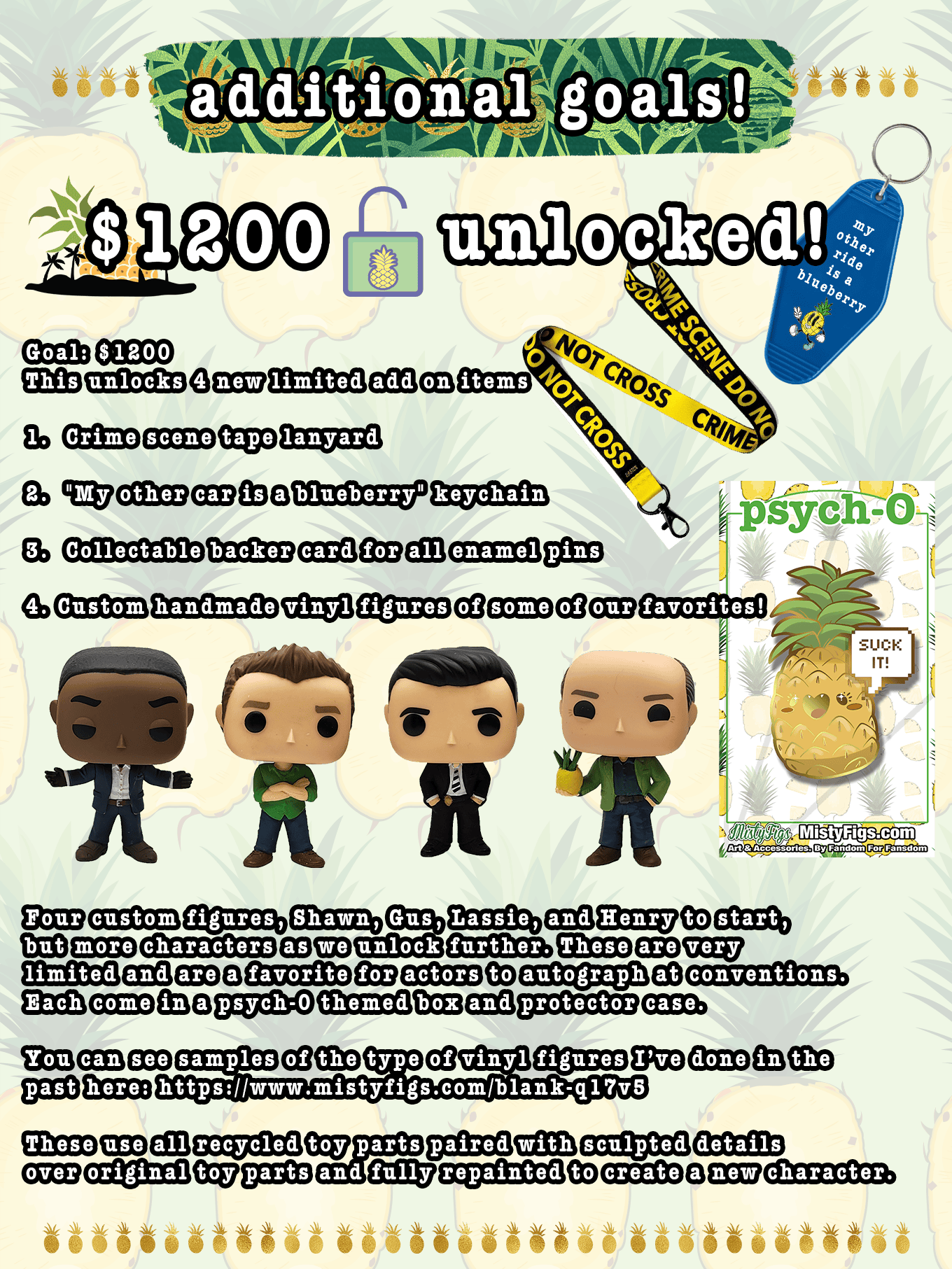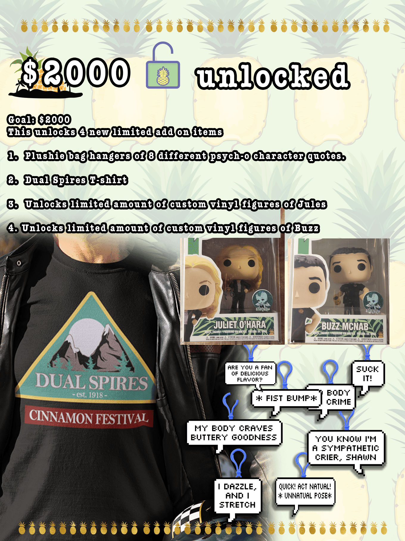 Are you a fan of delicious flavor? Do you find yourself drawn to fake psychics and sweet blueberry colored commuter cars? This is a project for all the Psych fandom fanatics out there. We are hoping to fund a line of Psych-o items that you'll love with words of wisdom and pineapple themed delights. Refreshing, and ever to green. Lets go!!!