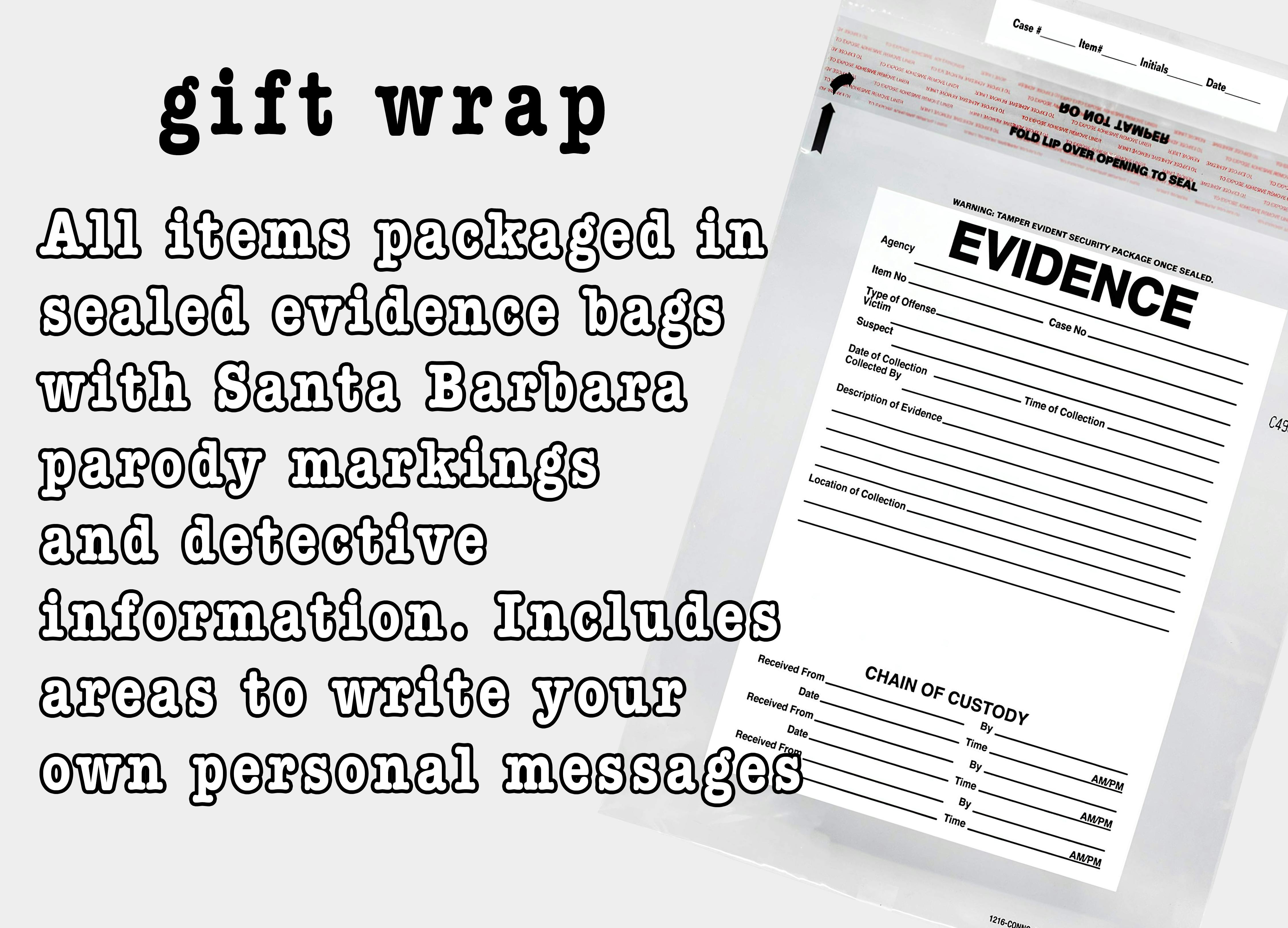 Gift Wrap With the gift wrap option, your order will be packaged in a Santa barbara PD themed evidence bag or multiple bags depending on the size of the order. Each has sections for you to fill out along with some dates, name, and location easter eggs