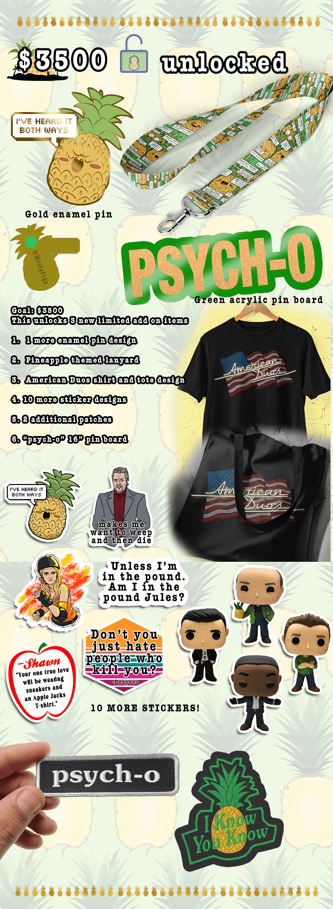 A project for all the Psych fandom fanatics out there. We are hoping to fund a line of Psych-o items that you'll love! Pins, stickers, shirts, and so much more.
