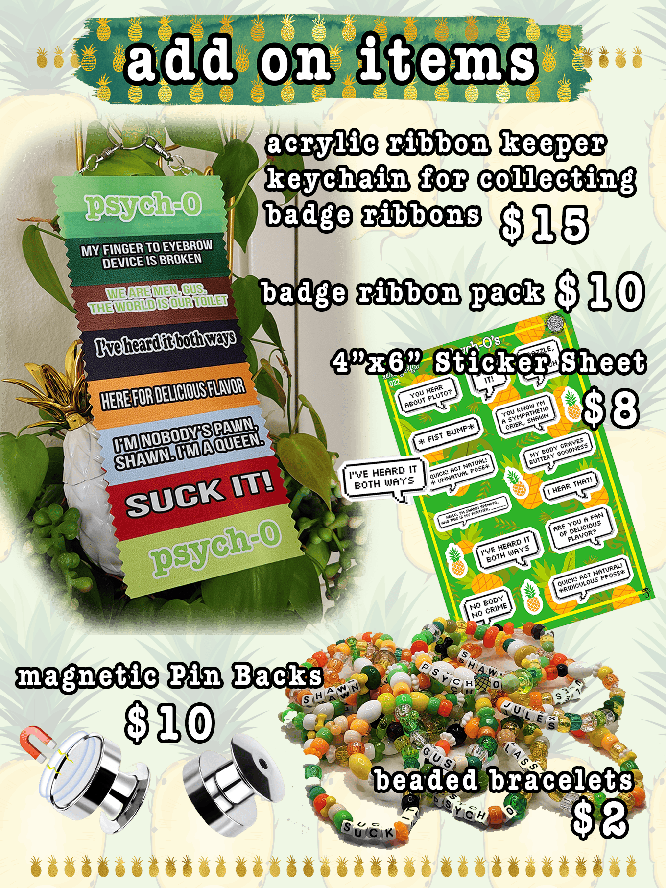Badge ribbon 6 pack Various mix and match badge ribbons with 6 different psych themed quotes. These are fun for trading and giving out at conventions. The colors may vary as we're working on the best colors to match each quote. Add them to your lanyard or a ribbon keeper keychain!
