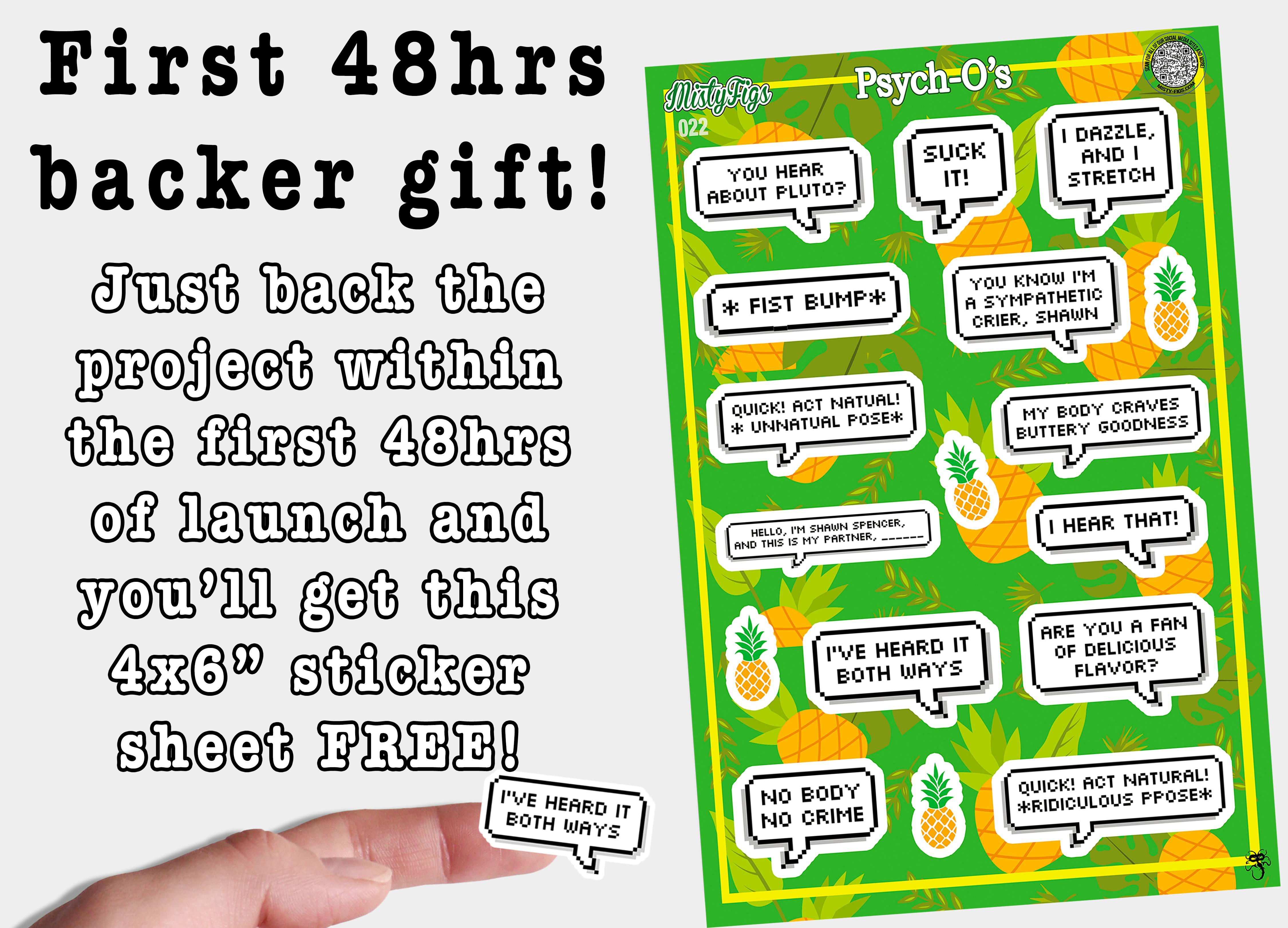 If you back the project in the first vital 48hrs, then you'll receive a free 4x6" waterproof vinyl sticker sheet, and if you back one of the listed early bird tiers you'll receive not only a discount on the tier but an early backer gift 3" acrylic psych-o magnet