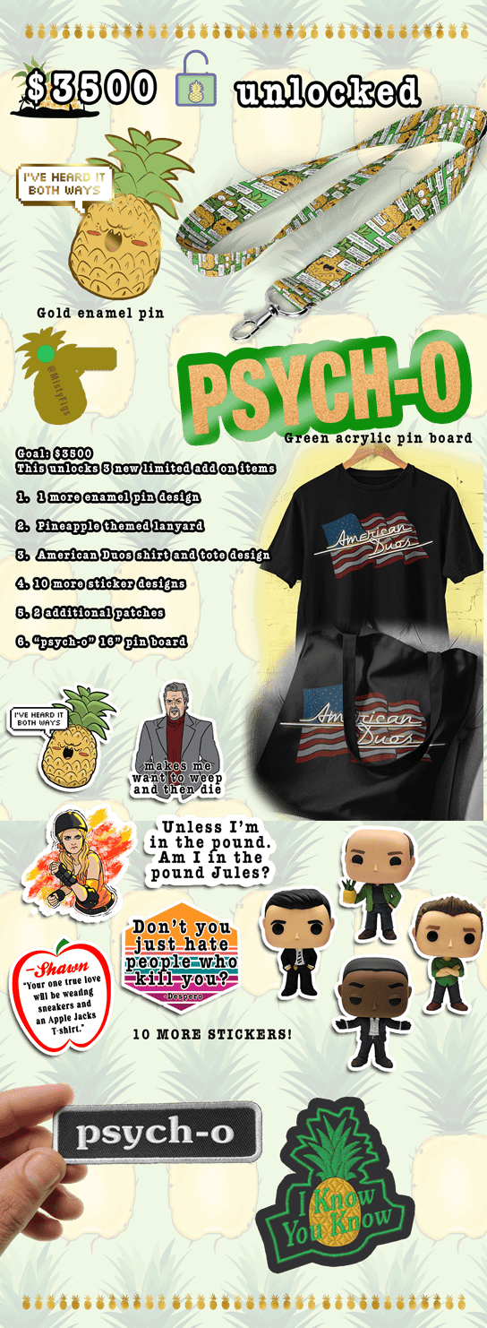 Ok we';re in the home stretch and we can't thank you enough for your support so far. Here are the $3500 unlock items, tweeked them a little bit to add some more sticker designs to include all the vinyl toys as stickers as well for those that requested, as well as a pineapple pin requested and the large 16" green acrylic psych-o pinboard!!