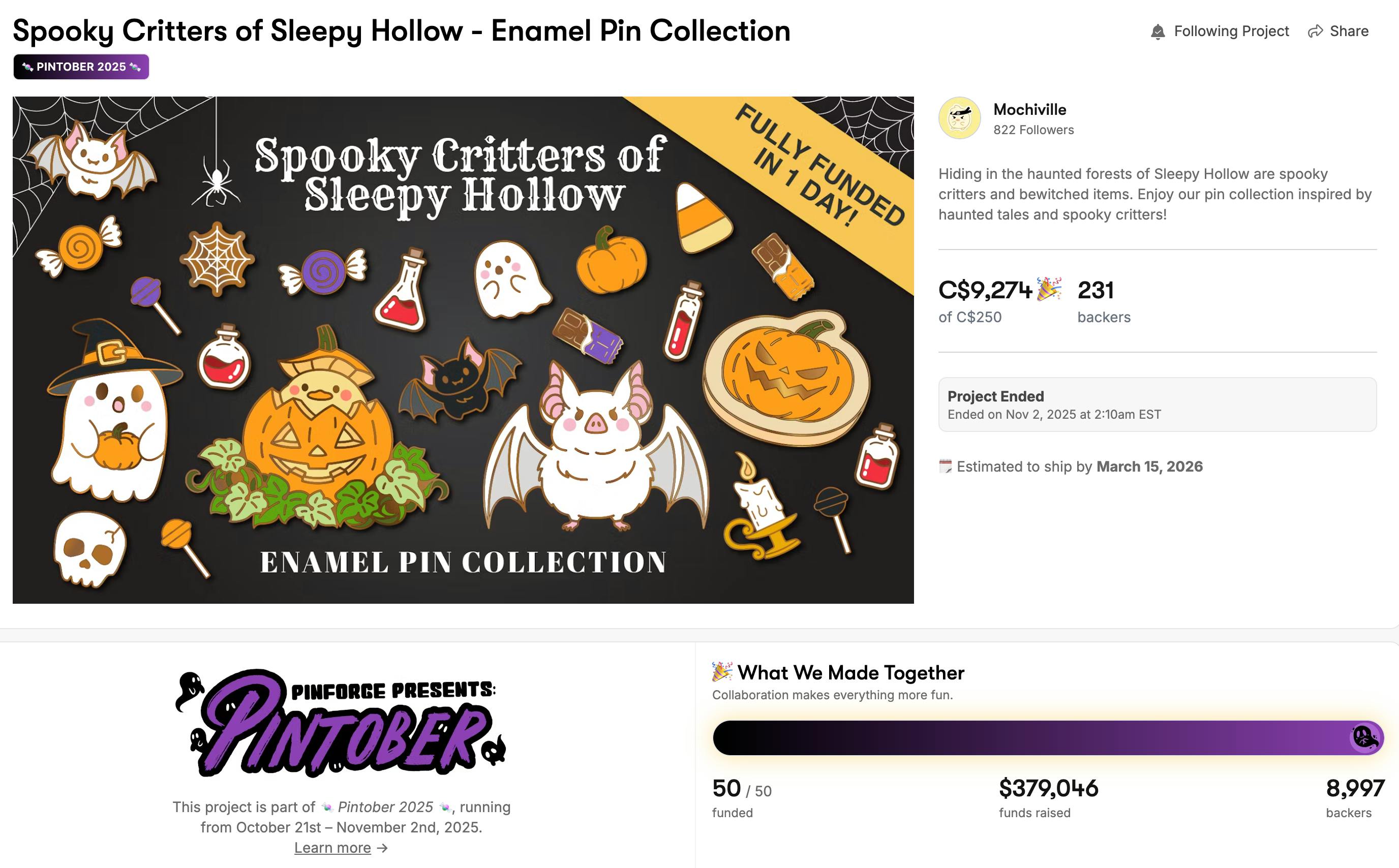 We did it!! ๐ฅณ๐๐ The Spooky Critters of Sleep Hollow - Enamel Pin Collection Backerkit campaign has officially ended. We are fully funded with all pin designs (including all stretch goals) unlocked! Thank you so much for believing in our project! โค๏ธ