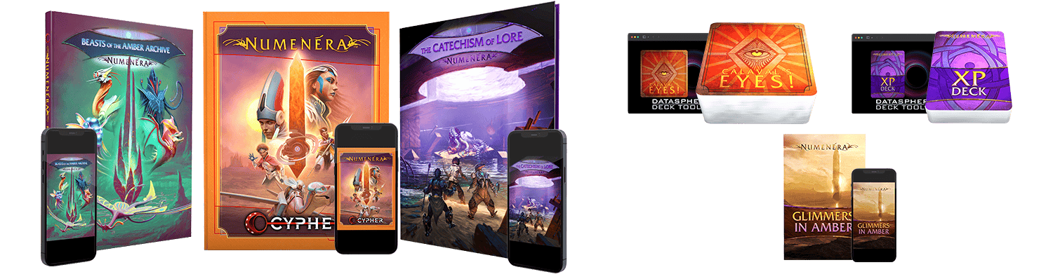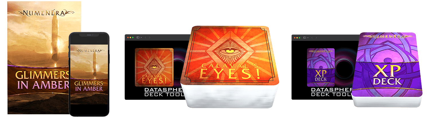 In addition, you get the useful Numenera XP Deck of XP tokens and the inspirational Calaval's Eyes! Deck that fires your imagination and keeps your game running smartly. You get these decks both in print and digitally through the very cool new Datasphere Deck Tool (see the main page for details). And you get the Glimmers in Amber zine in print and PDF.