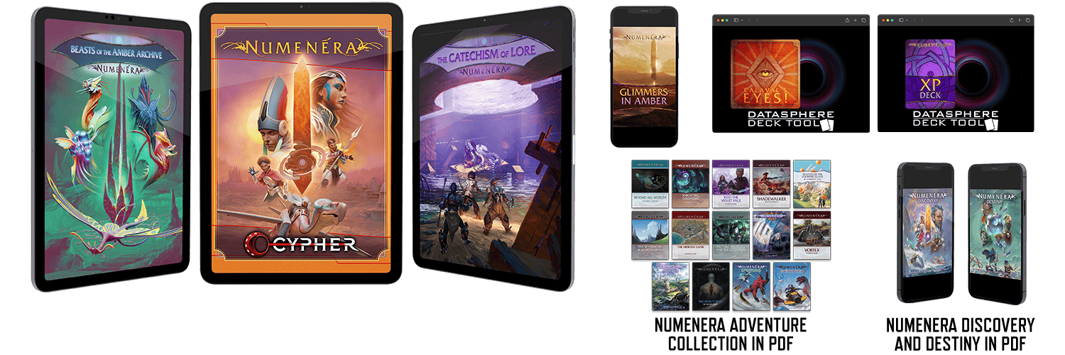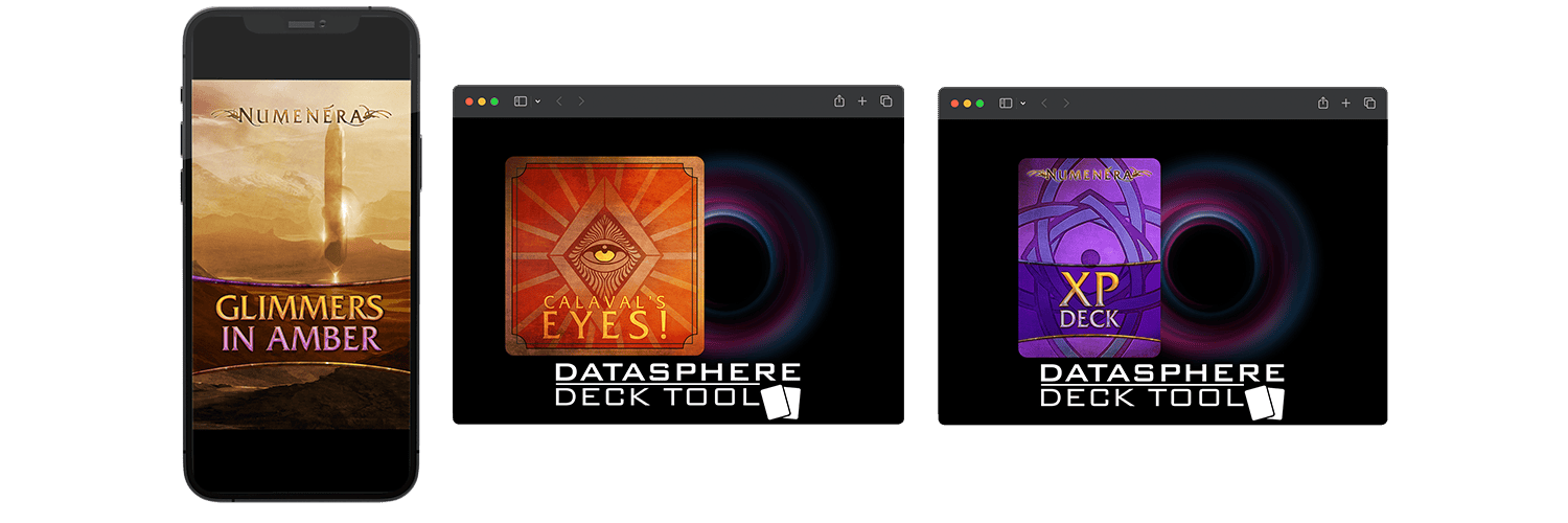 In addition, you get useful Numenera XP Deck of XP tokens and the inspirational Calaval's Eyes! Deck that fires your imagination and keeps your game running smartly. You get these decks digitally through the very cool new Datasphere Deck Tool. (Just want them in PDF? That's cool—with access to the Datasphere Deck Tool you can download standard PDFs of your decks at any time! See the main page for details.) And you get the Glimmers in Amber zine in PDF.