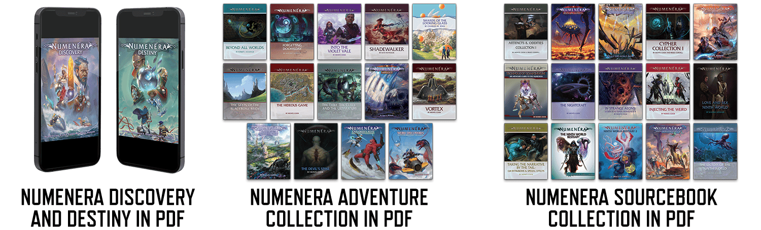 This is a great deal already, but it gets better with a huge library of existing Numenera titles in PDF. You get, as a free bonus, PDFs of the current Numenera Discovery and Numenera Destiny corebooks, fifteen adventure titles featuring dozens of adventures, and fifteen sourcebooks covering a huge variety of Numenera topics. It's roughly 2600 pages of high-quality content, valued at roughly $285—and completely free with this pledge level! These items will be delivered early, so you can start exploring the Ninth World right away.