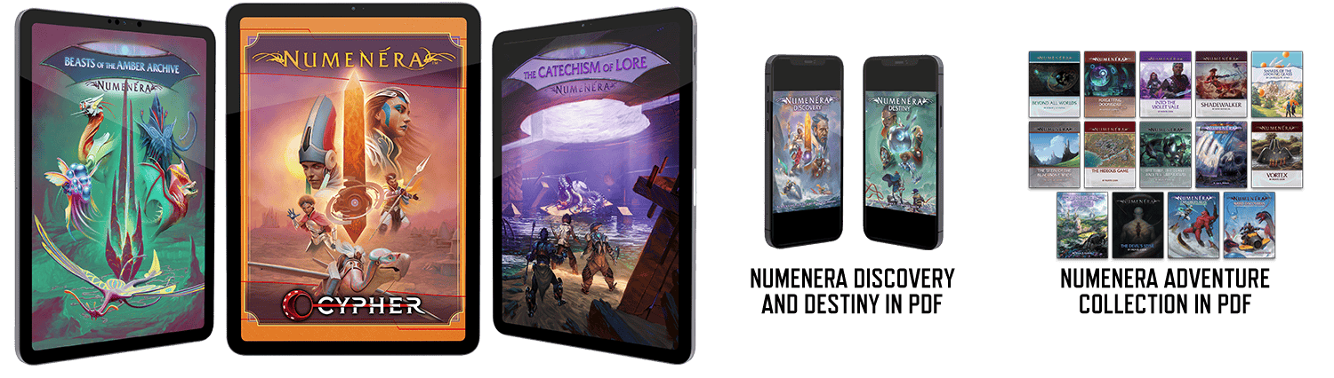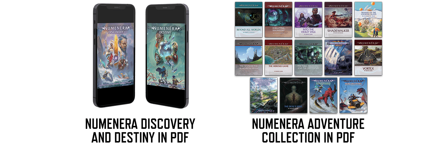 This is a good deal already, but it gets better with a free library of existing Numenera titles in PDF. You get, as a free bonus, PDFs of the current Numenera Discovery and Numenera Destiny corebooks plus fifteen adventure titles featuring dozens of adventures. That's over 1300pages of high-quality content—over $135 in value—completely free with this pledge level. These items will be delivered early, so you can start exploring the Ninth World right away.