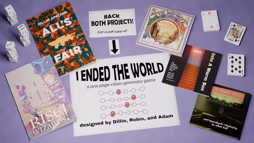 PLUS! If you back both of our projects, you'll get access to an extra one-page game designed by Adam, Dillin, and Robin that pulls inspiration from all 5 games across both projects.