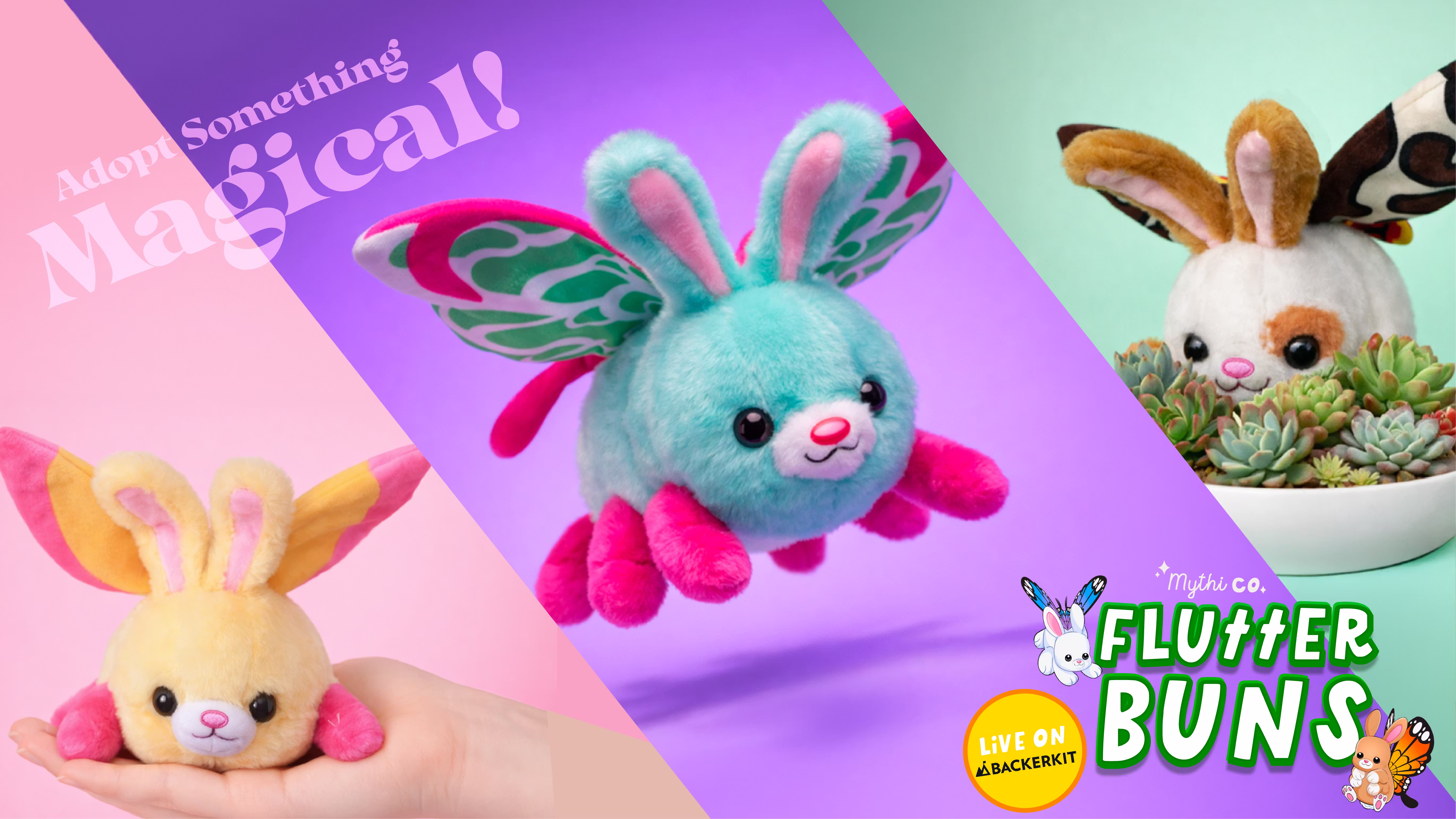 Flutter Buns is a line of small, weighted plush creatures that blend bunnies and butterflies into one whimsical friend. Each one features soft floppy ears, fluttery wings, and a gentle weight for a calming cuddle. Available in a handful of magical species