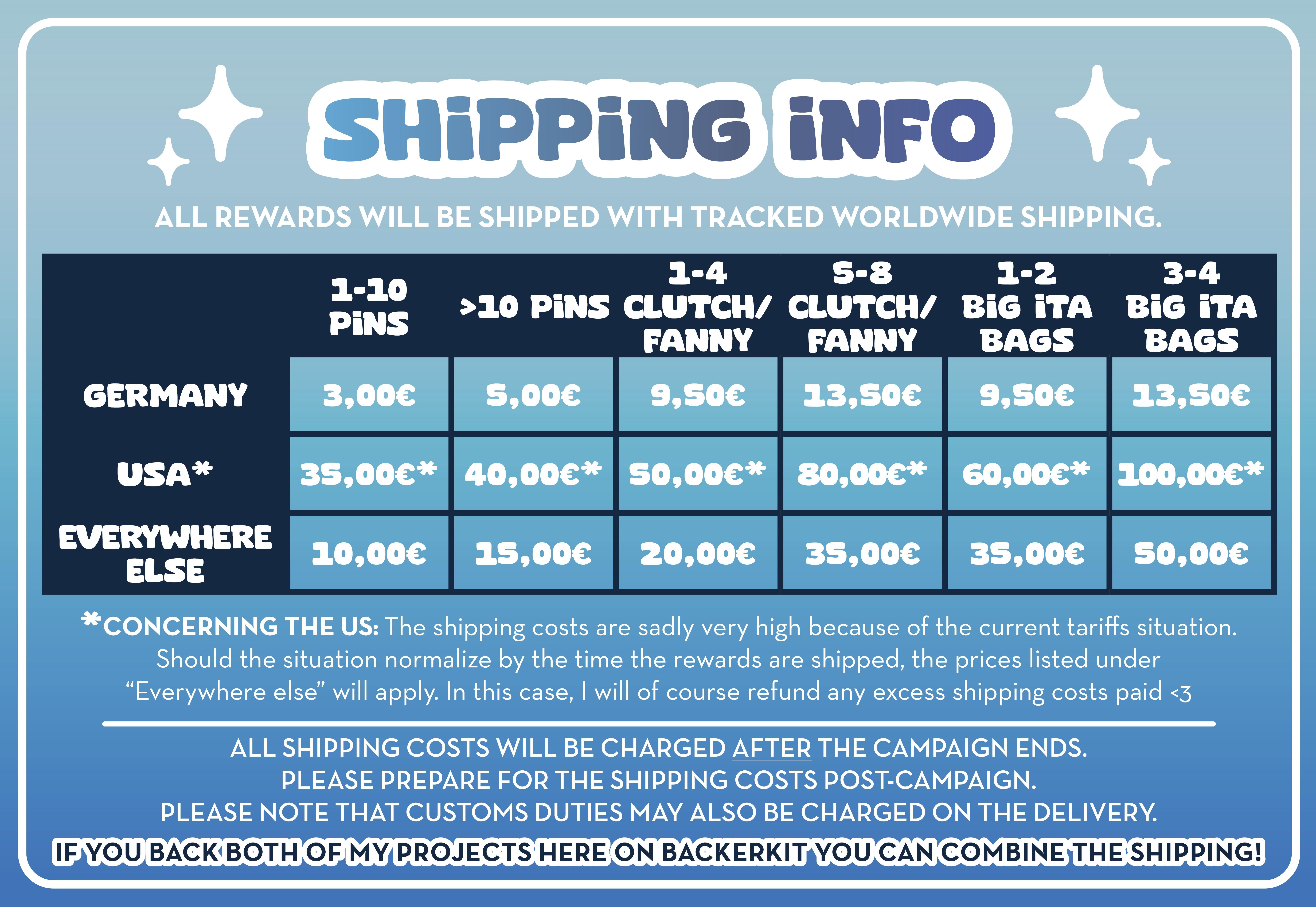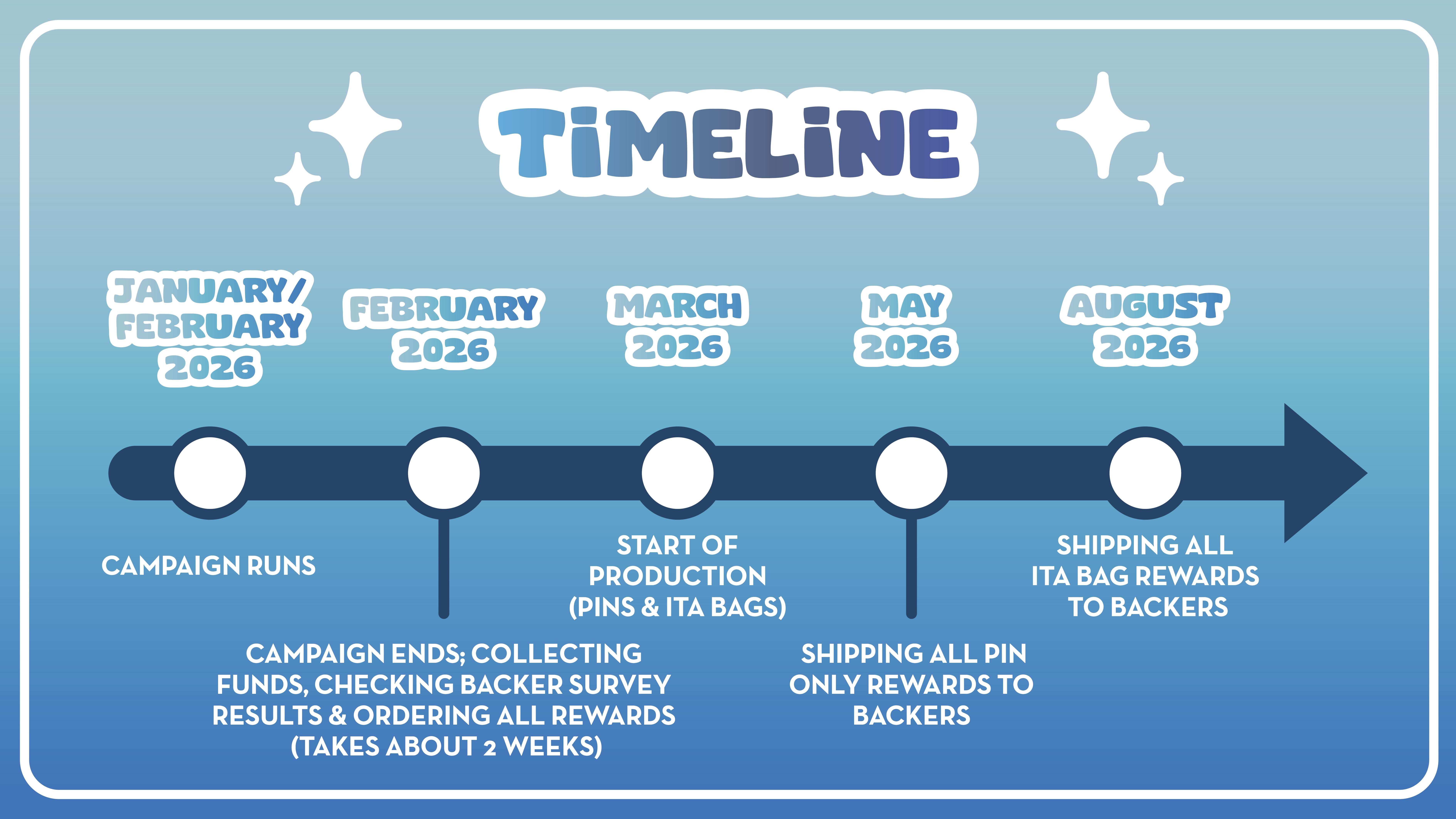 It may happen that I’m able to ship your pins/Ita Bags earlier, depending on when I get your backer survey results and depending on how fast the manufacturer is. The manufacturer I chose is pretty quick – but May 2026 is the latest possible time you should get your pins and August 2026 is the latest time you should receive your Ita Bag orders <3