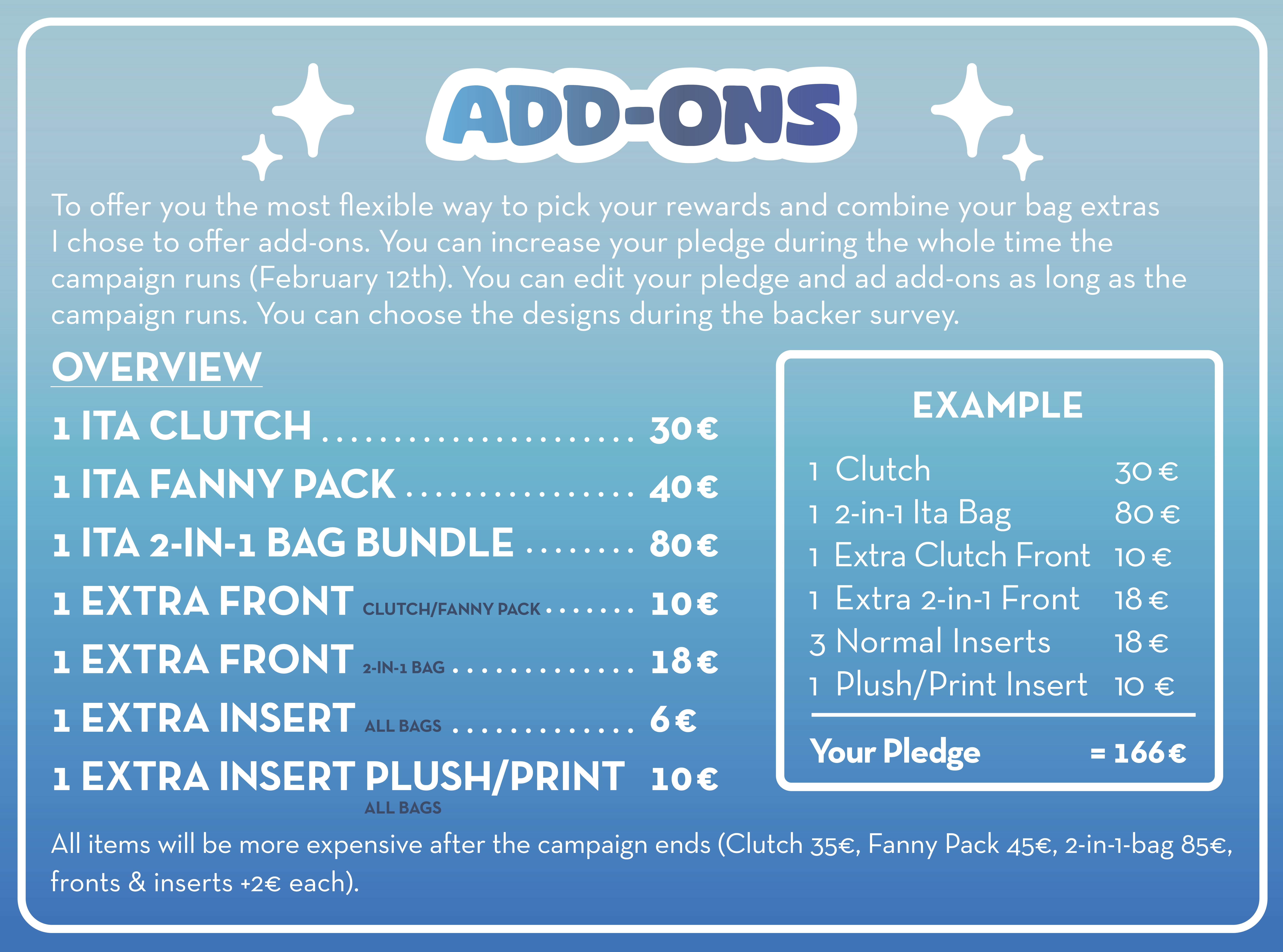 Backing this project helps me fund this collection. As we get more pledges, more Ita Bags & extras will be unlocked, which gives you a greater range to choose from.