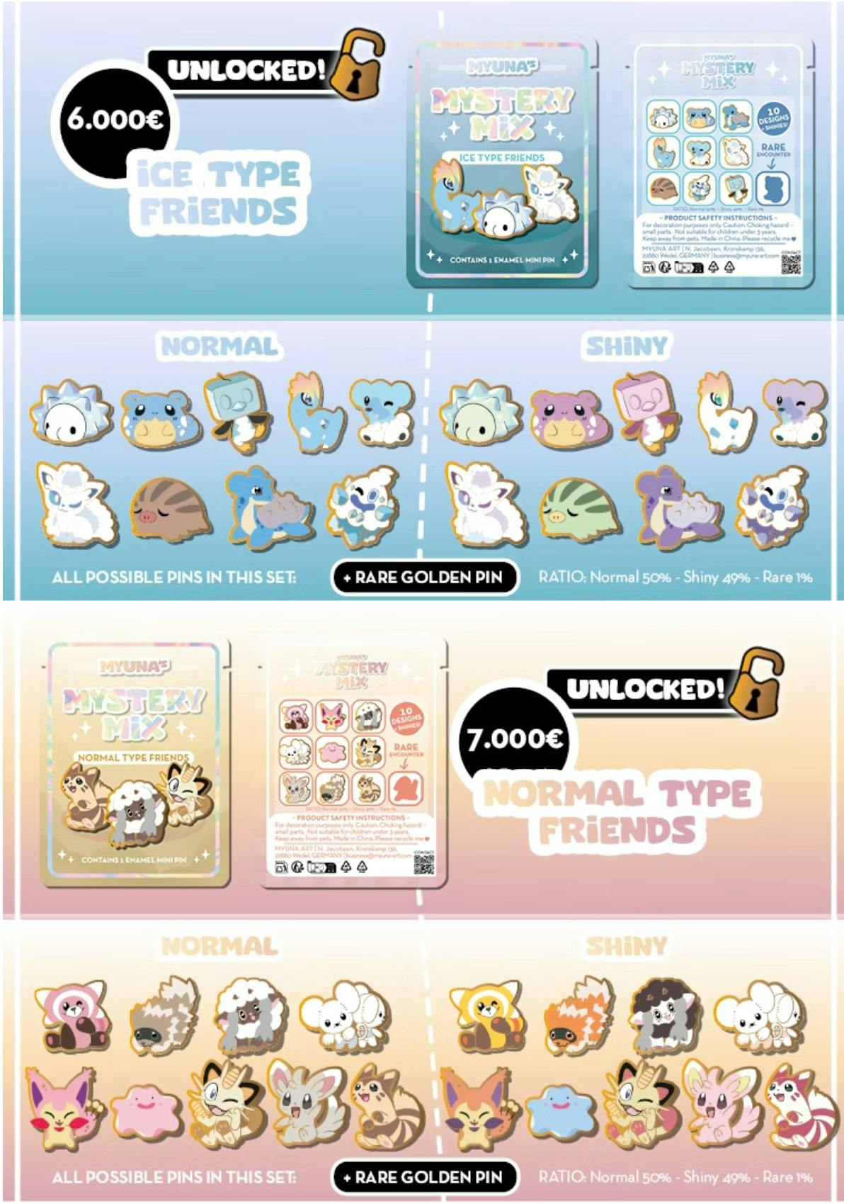 I also added new add-on variants: Half set: 9x Mini pin (1x each pin of the set either normal OR shiny) Full Set: 18x Mini pin (1x each pin of the set in normal AND shiny, WITHOUT the rare golden pin) You cannot mix normal and shiny pins in the half sets; please continue to use the “specific pin” option for this. This bundle saves you a few €/$ if you want a lot of pins from a specific set.