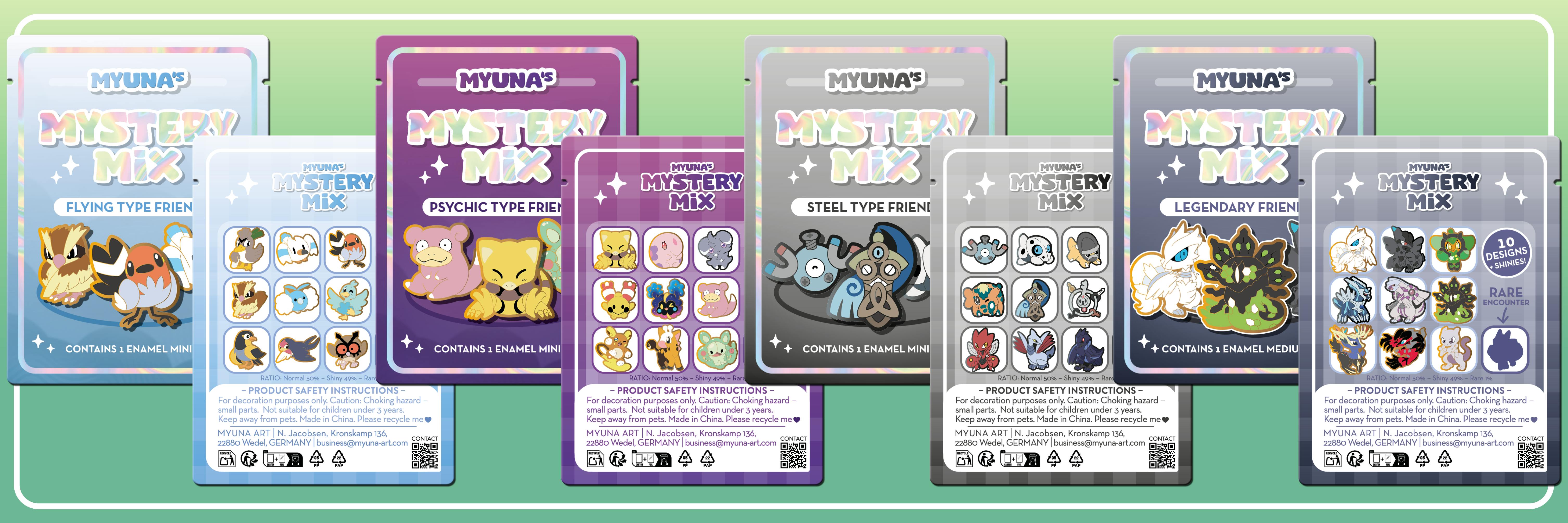 New sets: Flying, Psychic, Steel AND Legendary Friends now available! Your massive support motivated me to give my all and draw 4 new sets since the last update! You can select the new sets in the Backer Survey and, if necessary, increase the number of mystery mixes you need. I am VERY excited about the new sets! Instead of the 8 sets we had planned, we now have 15 (oops). The Legendary Pins are medium pins, so they are slightly larger than the rest of the Mystery Mixes.